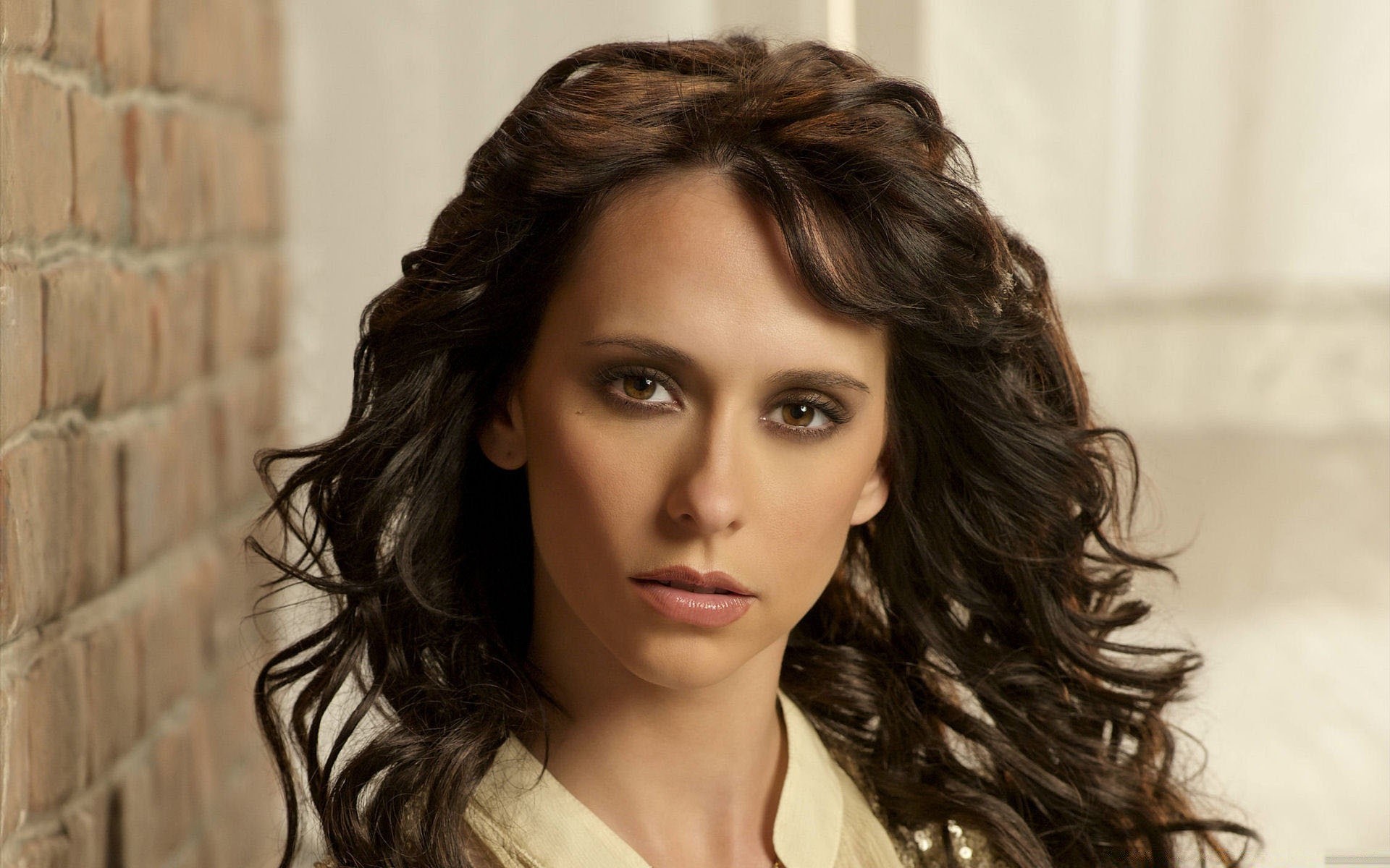 Dziewczyna na tle ściany z ciemnymi włosami