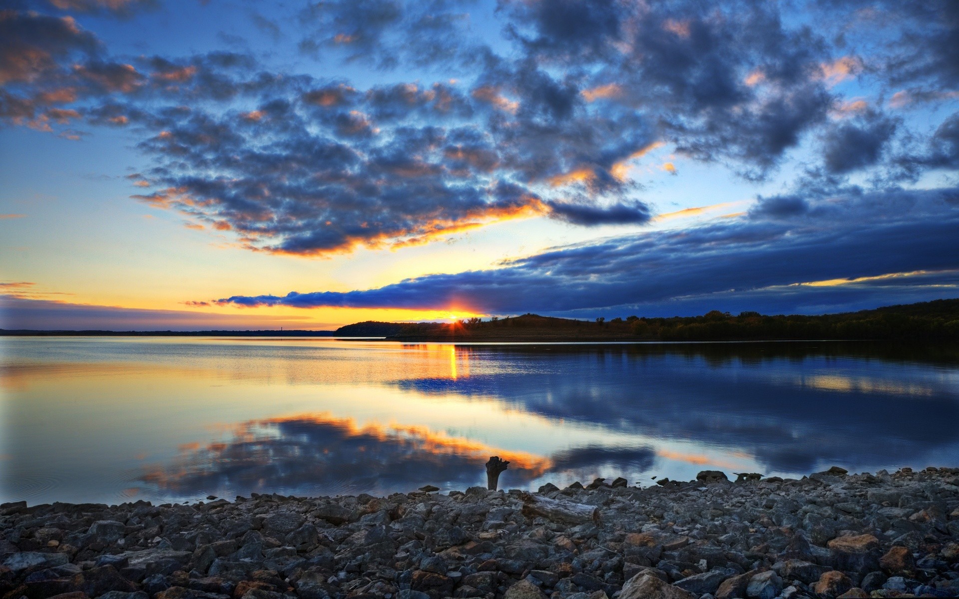 Intensywnie niebieskie chmury zasłaniające Zachód słońca nad jeziorem