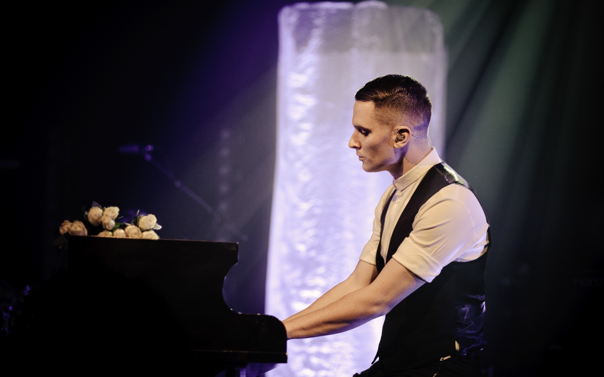 Mężczyzna siedzący ekspresyjnie za instrumentem muzycznym