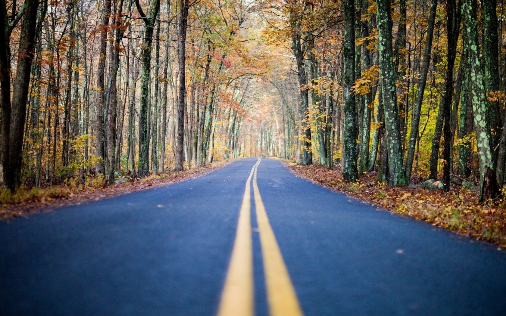 Asfalt pokryty kolorowymi liśćmi w jesiennym lesie