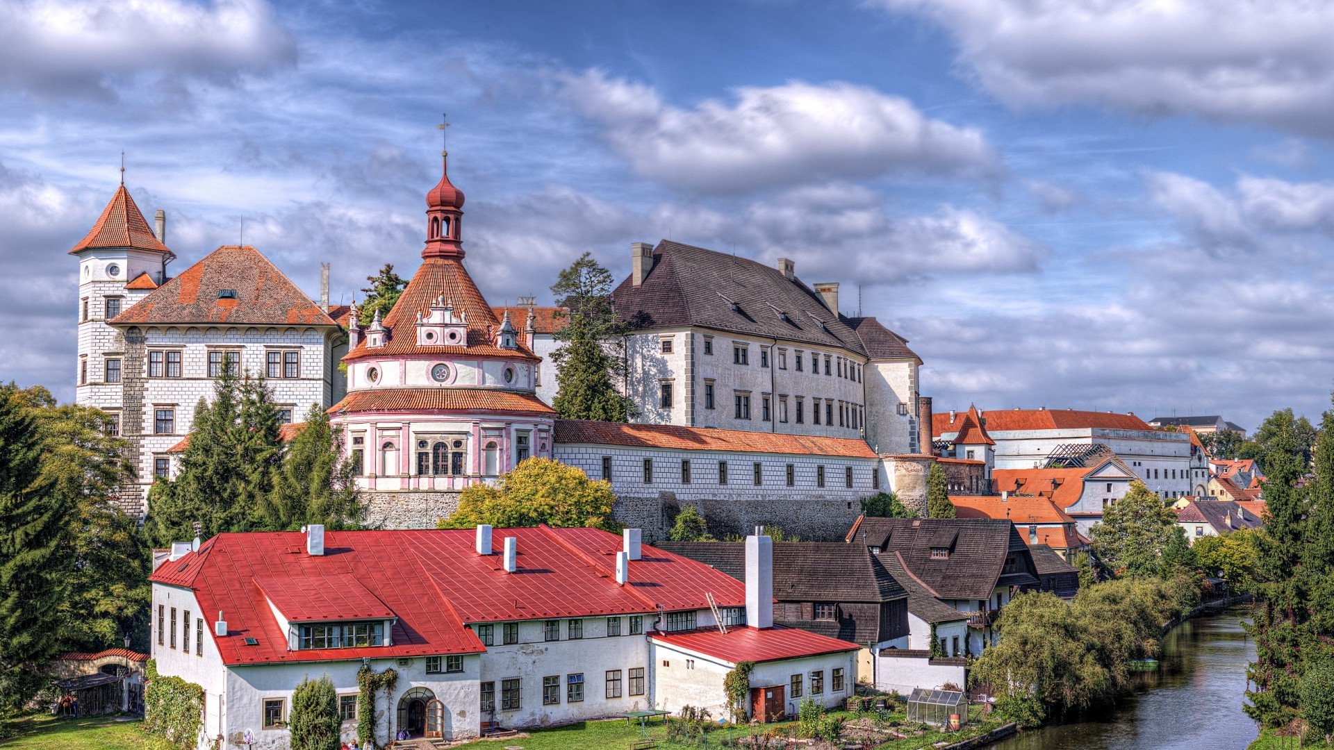 Majestatyczny zamek na tle zachmurzonego nieba