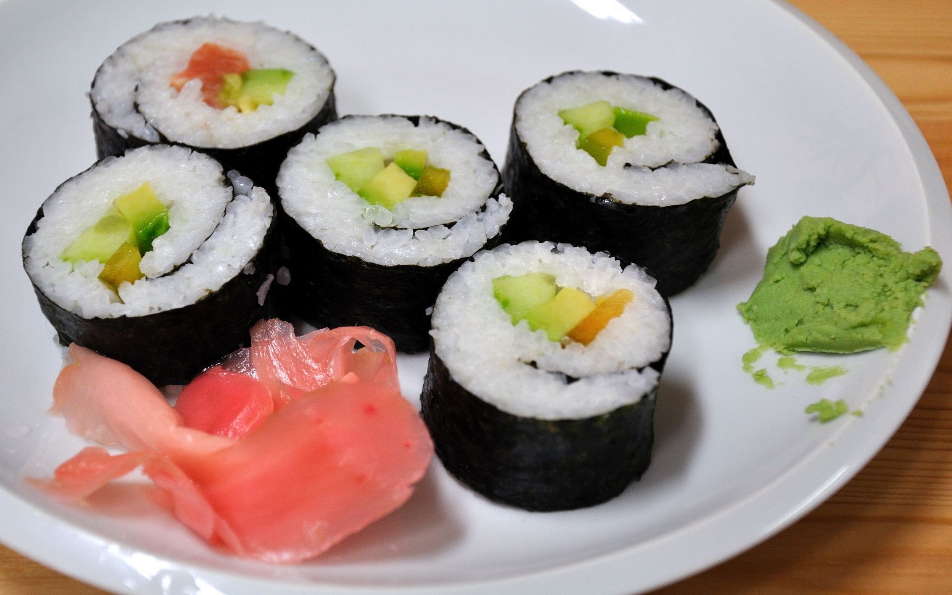 Zamawianie bułek i sushi. Wassabi na talerzu