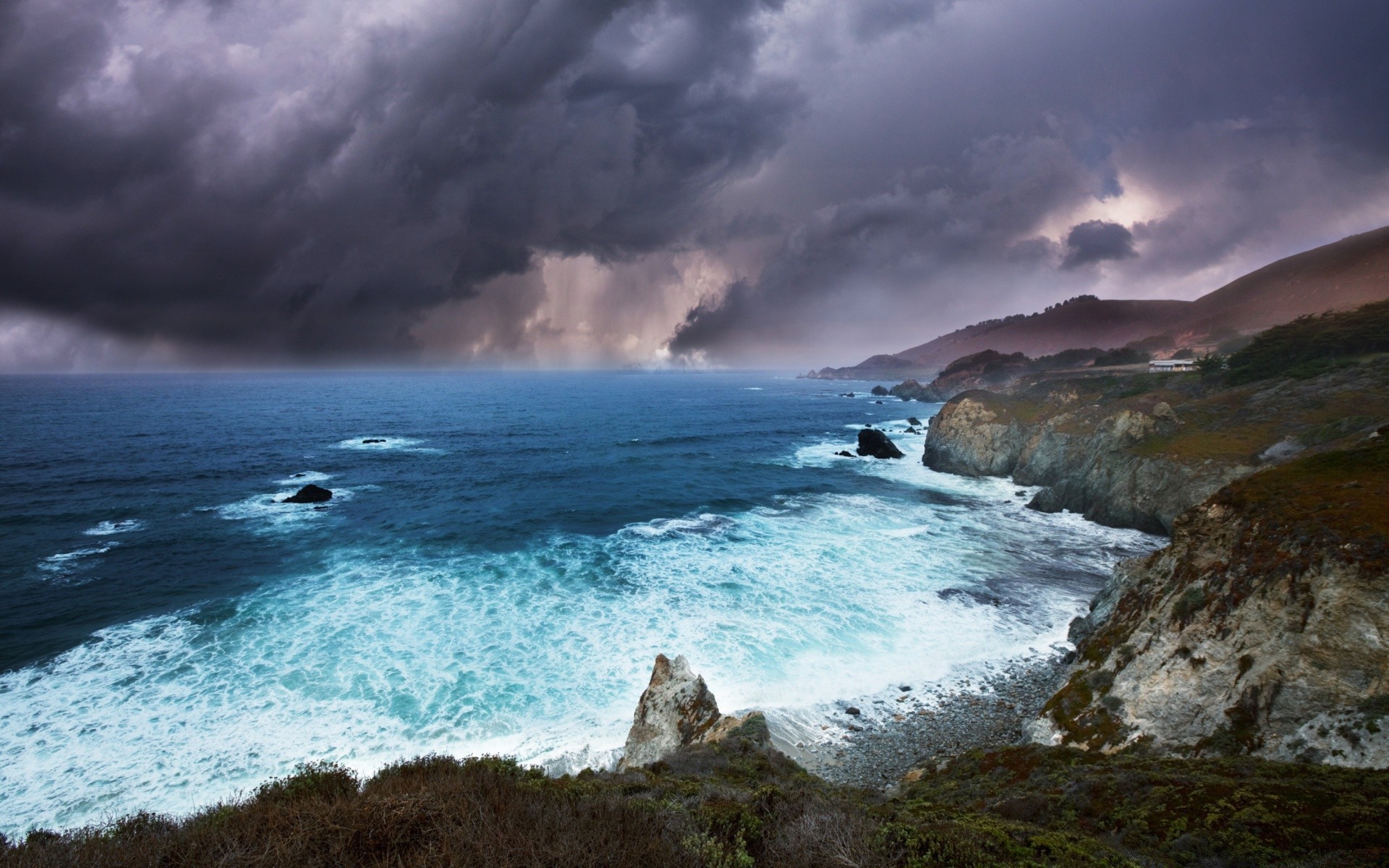 Woda morska szaleje na skalistych brzegach pod zachmurzonym niebem