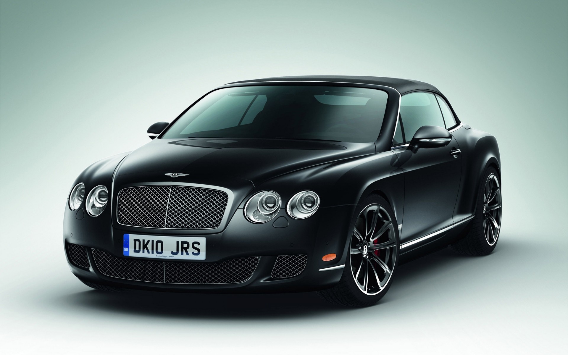 Czarny Bentley na autostradzie zimą. Na tle gór i nieba