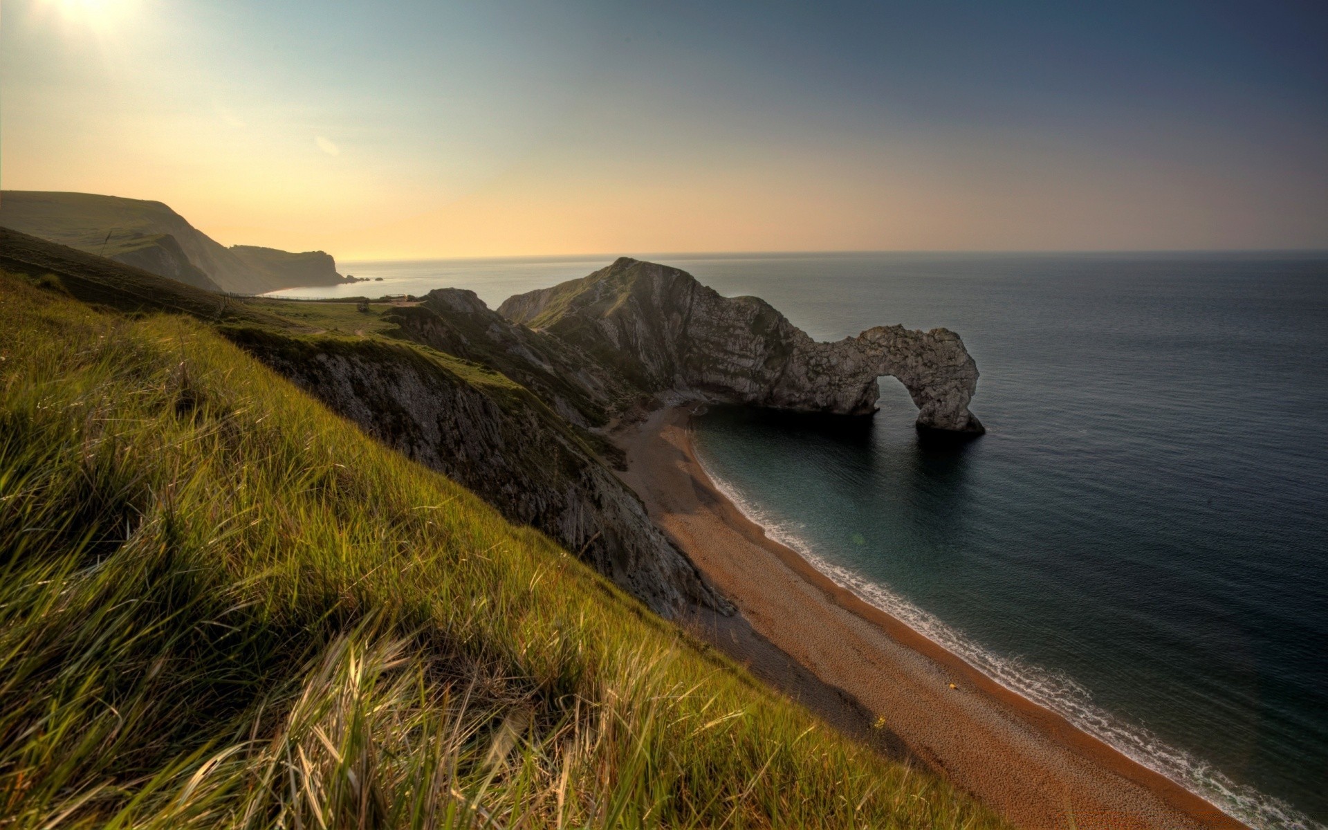 Przybrzeżne klify i morska Wyspa w oddali na tle zachodu Słońca