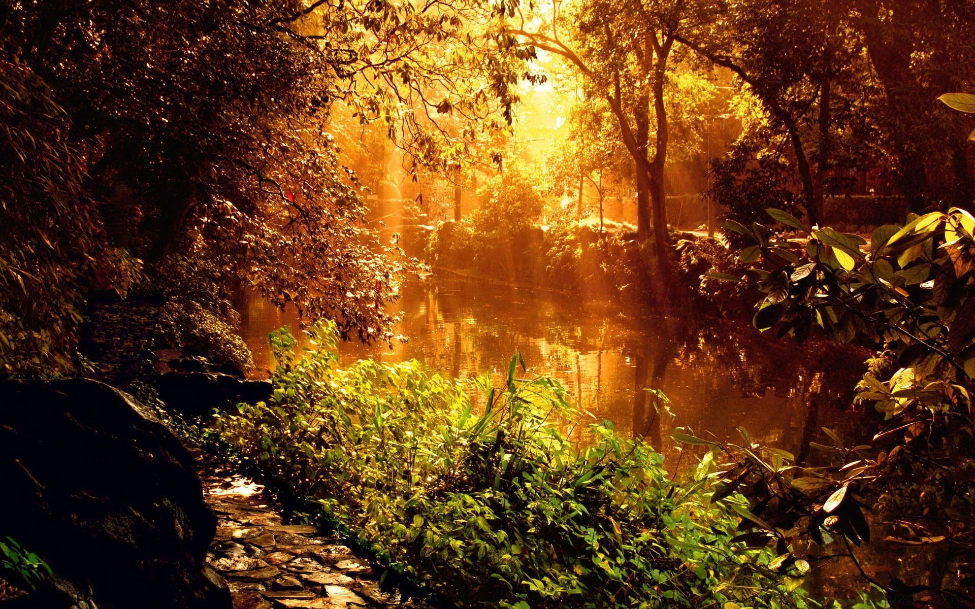 Słońce swoimi promieniami przenika przez liście oświetlając rzekę