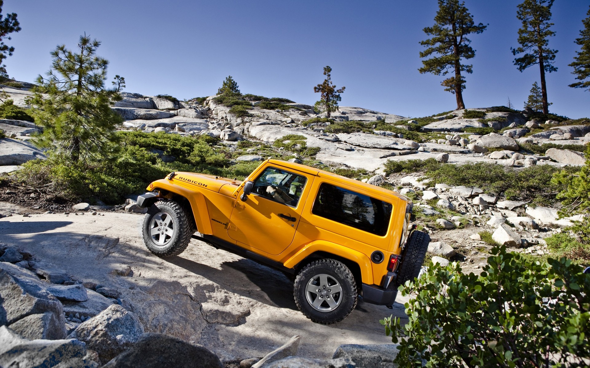 Żółty Jeep przedziera się przez skały na zewnątrz