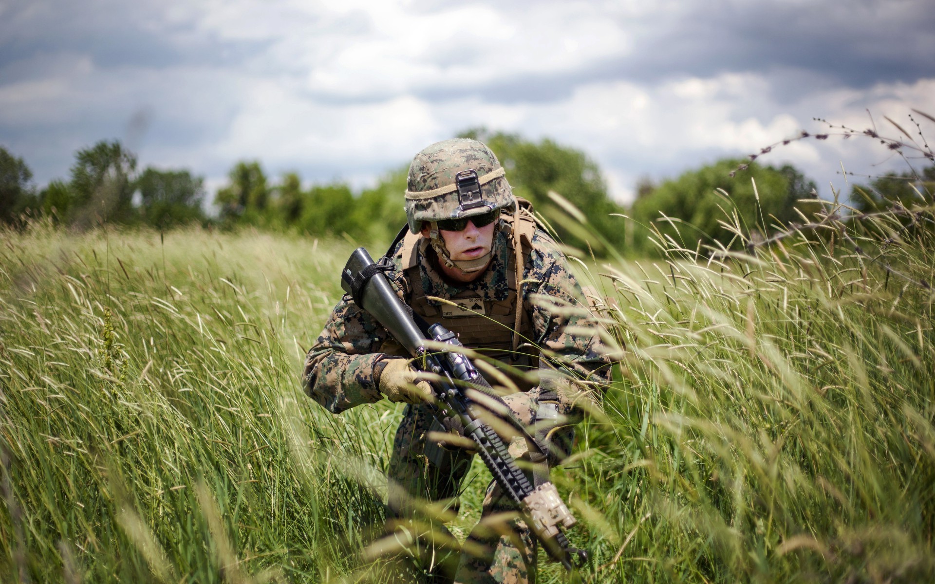 Żołnierz w mundurze przedziera się przez wysoką trawę na polu