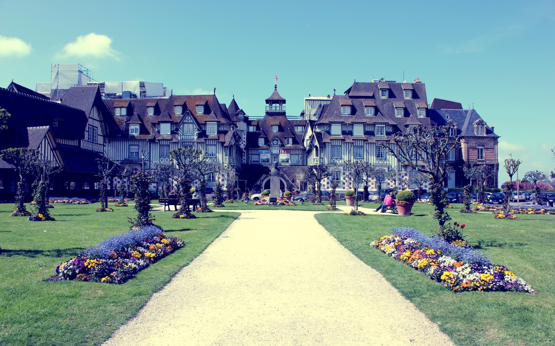 Budynek z piękną architekturą na tle błękitnego nieba z chmurami na brzegu akwenuBudynek z piękną architekturą na tle błękitnego nieba z chmurami na brzegu akwenu