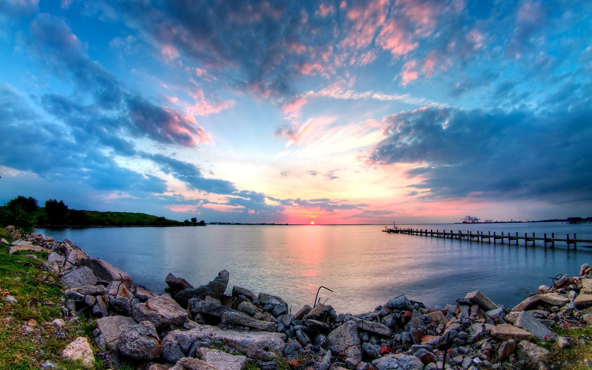 Niebieski zachód słońca nad jeziorem. Zmierzch nad wodą