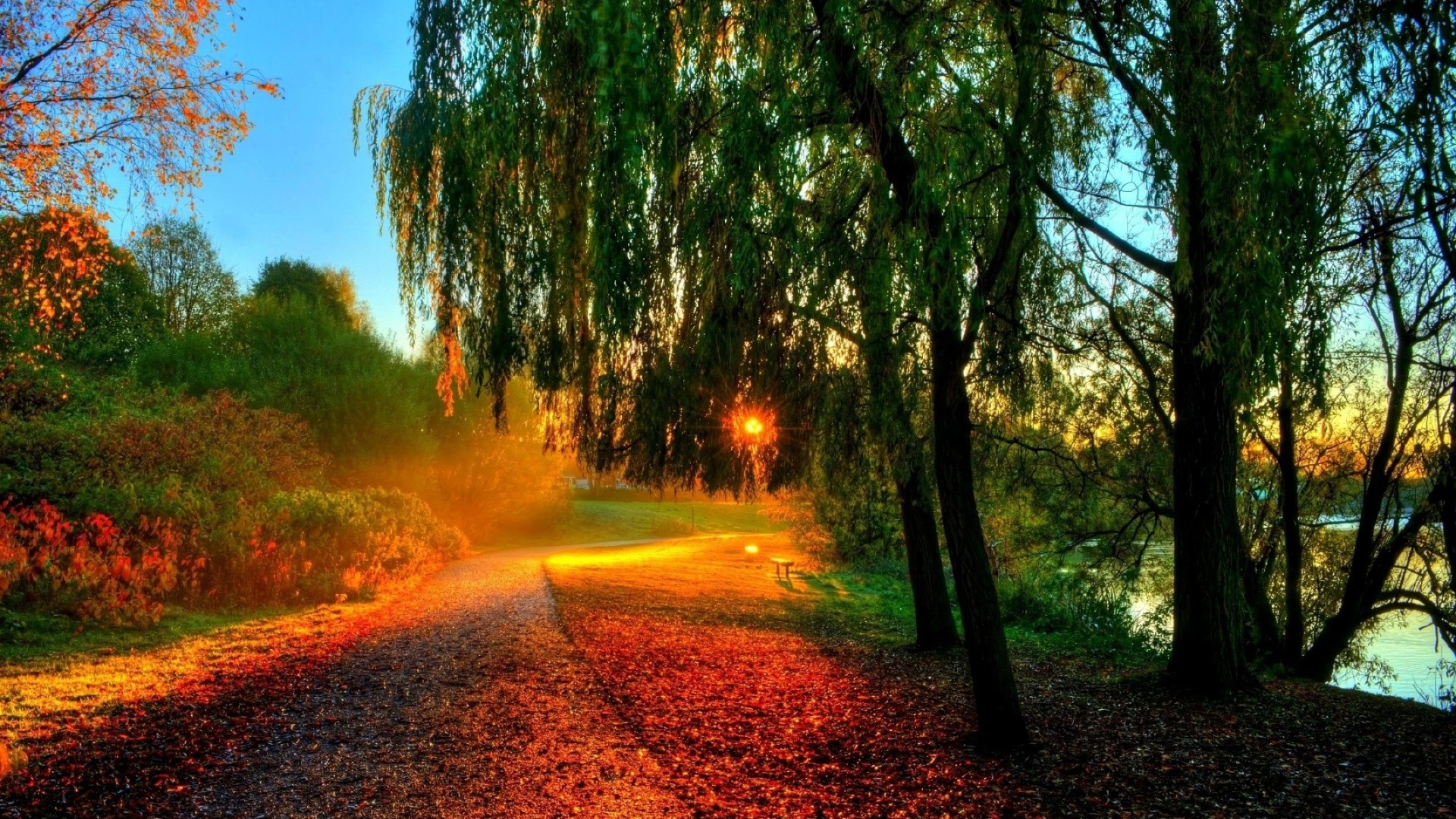 Jesienna Przyroda, drzewa i zachód słońca