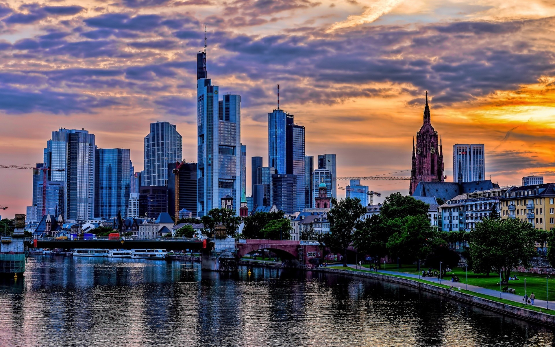 Rzeka z mostami łączącymi Dwa Brzegi współczesnego miasta z wieżowcami