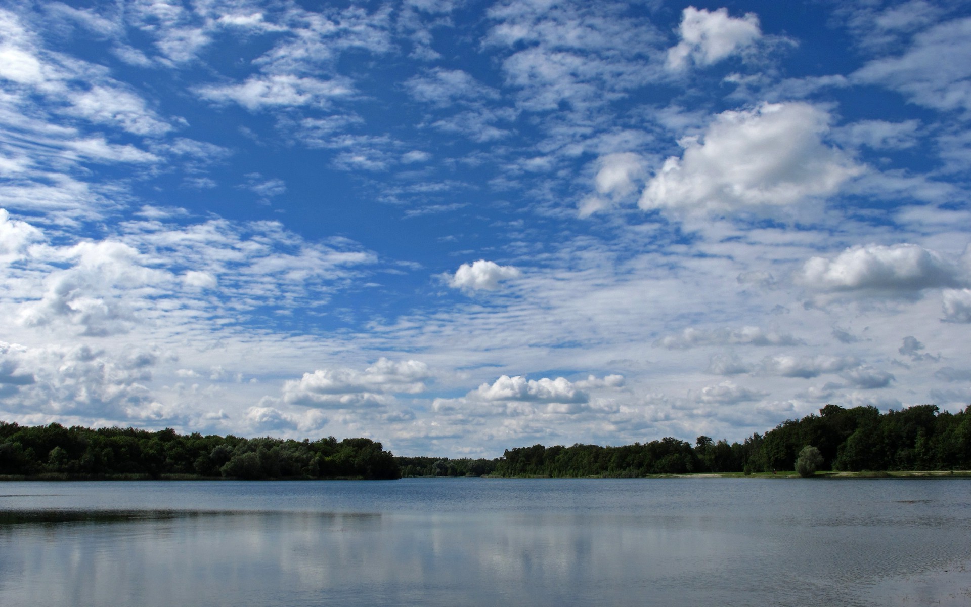 Krajobraz jeziora, drzew i błękitnego nieba z chmurami