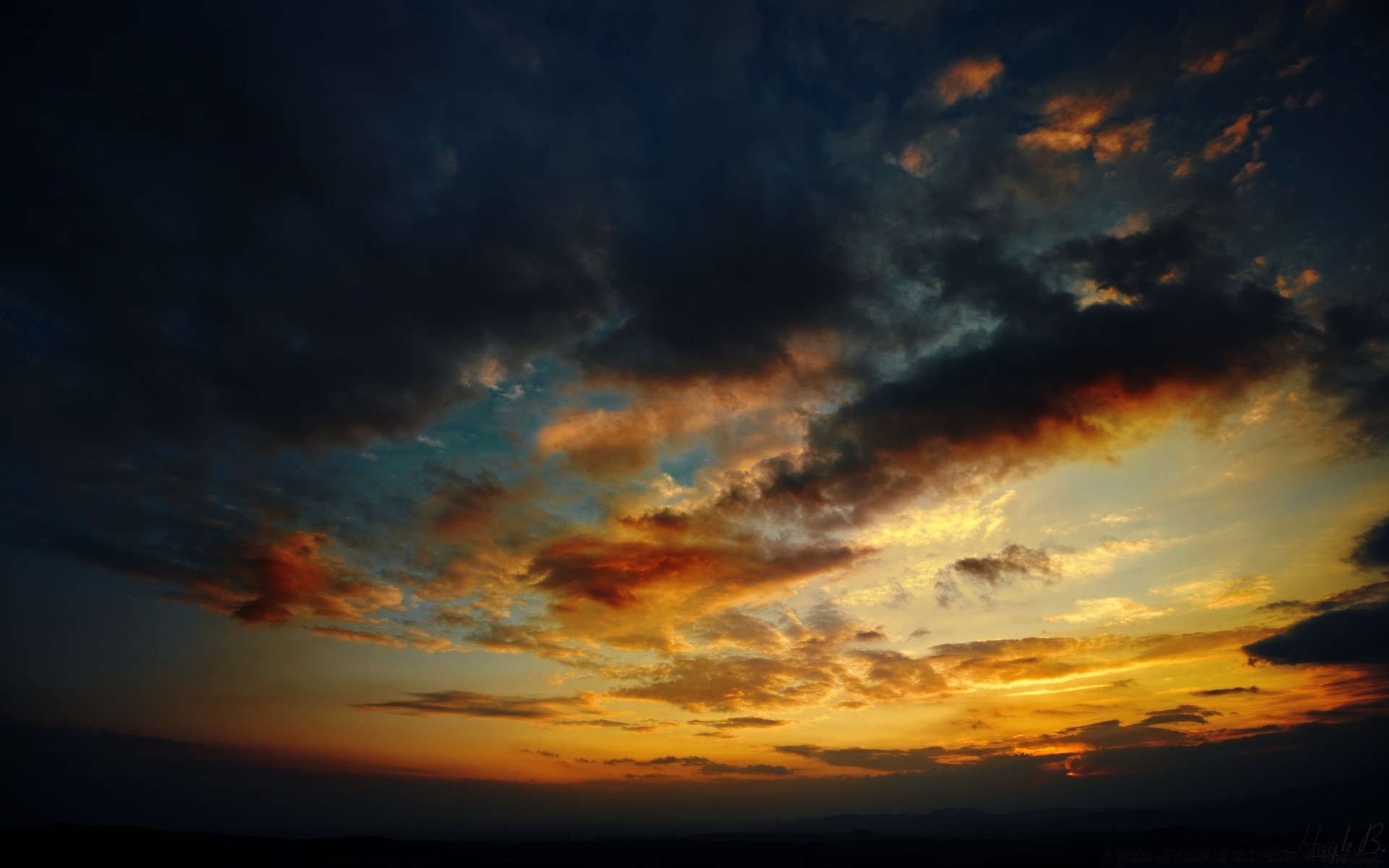 Przedzierając się przez chmury, słońce zachodzi za horyzontem