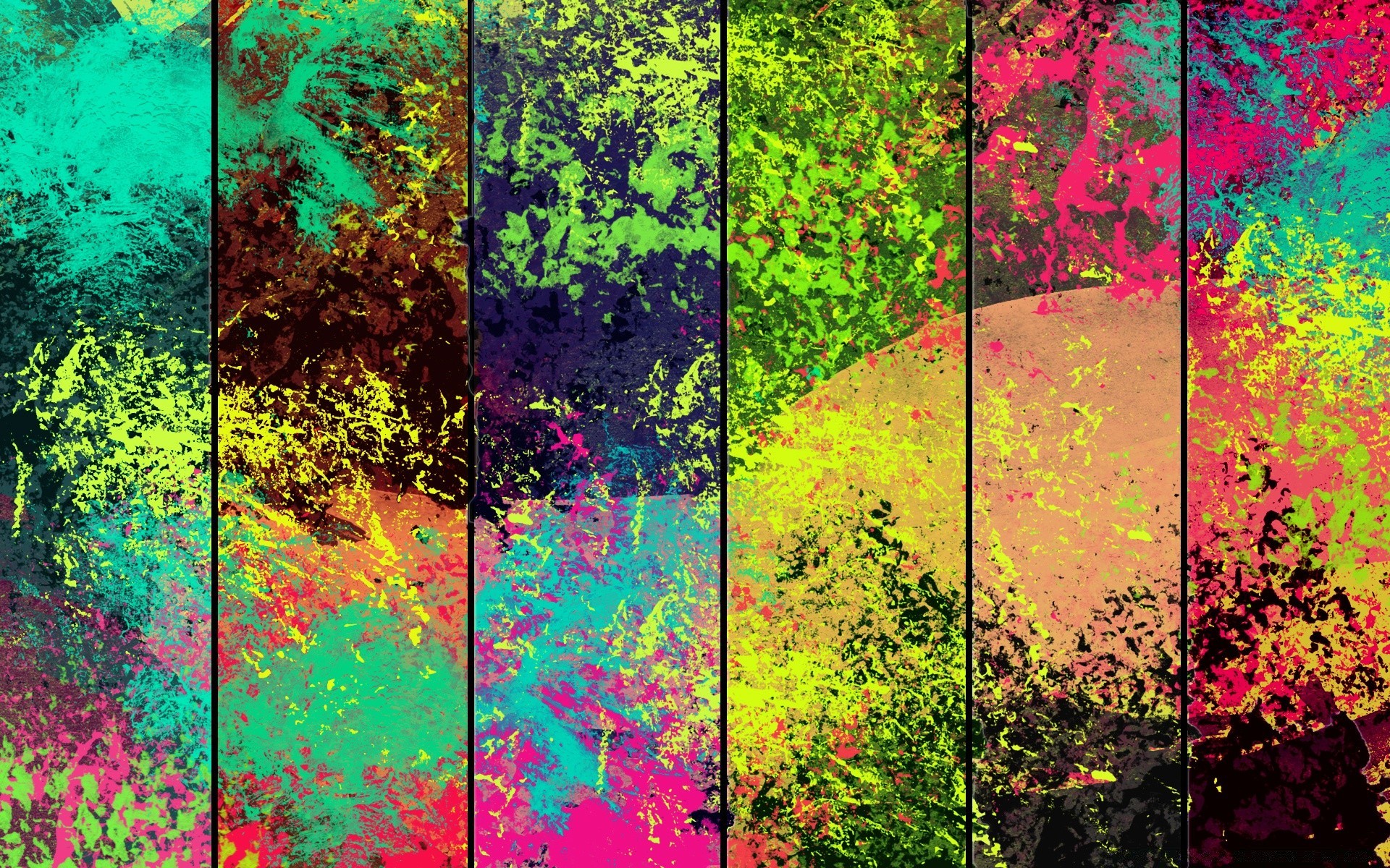 Wnętrze z kolumną, czerwoną zasłoną i obrazem przedstawiającym przyszłość