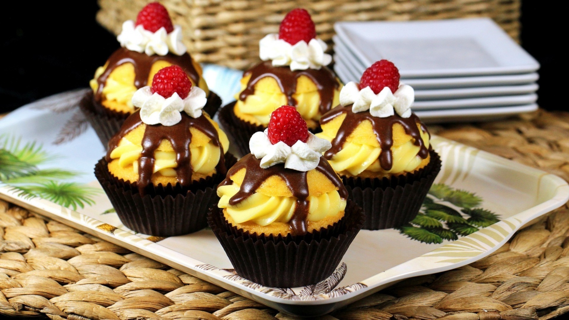 Pyszny deser ze słodką śmietaną skropiony czekoladą