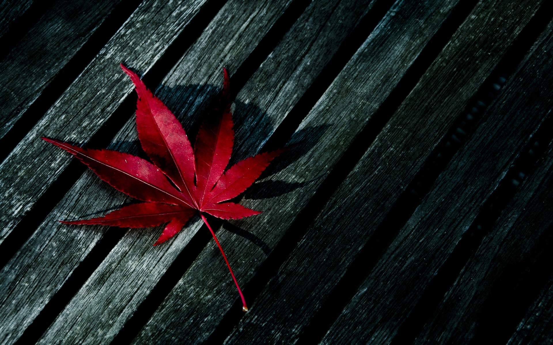 Czerwony liść na starej drewnianej ławce
