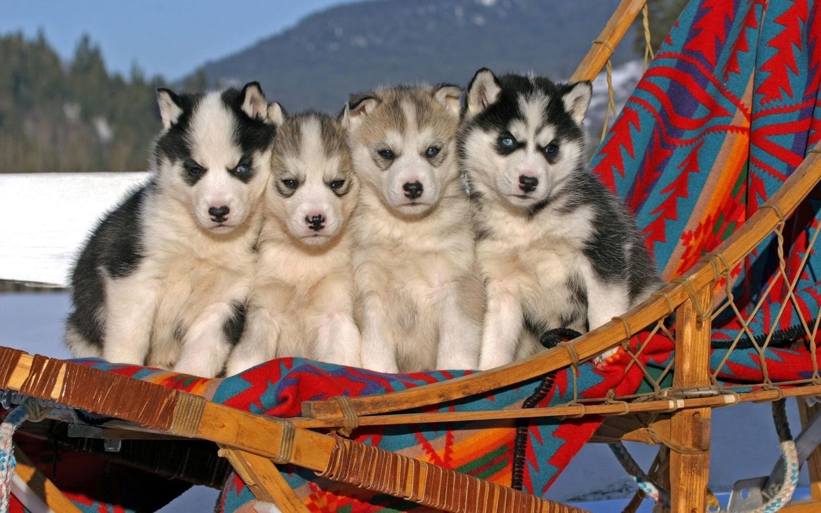Cztery Śliczne szczeniaczki na psim zaprzęgu