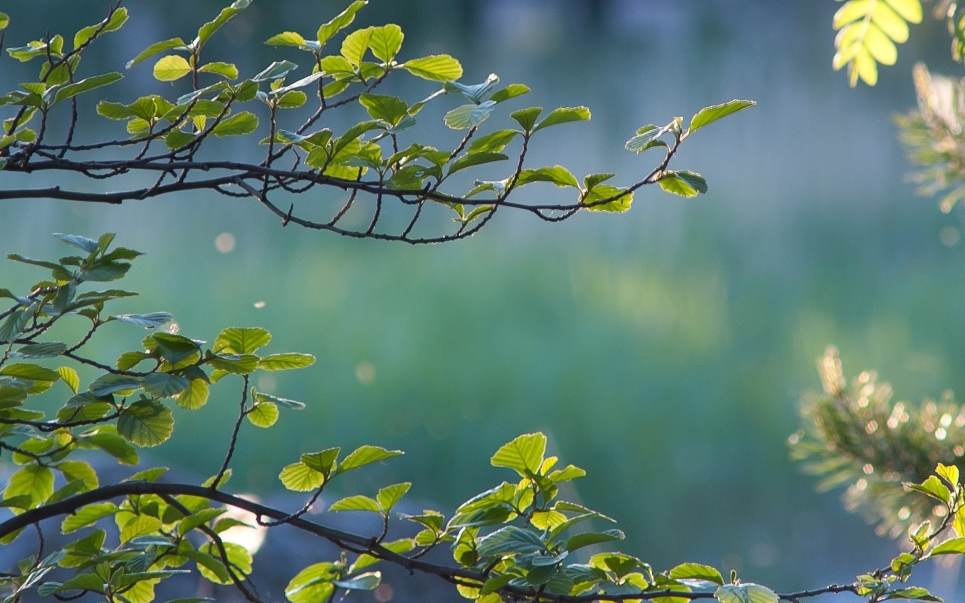 Gałęzie z zielonymi liśćmi na niebieskim tle lasu