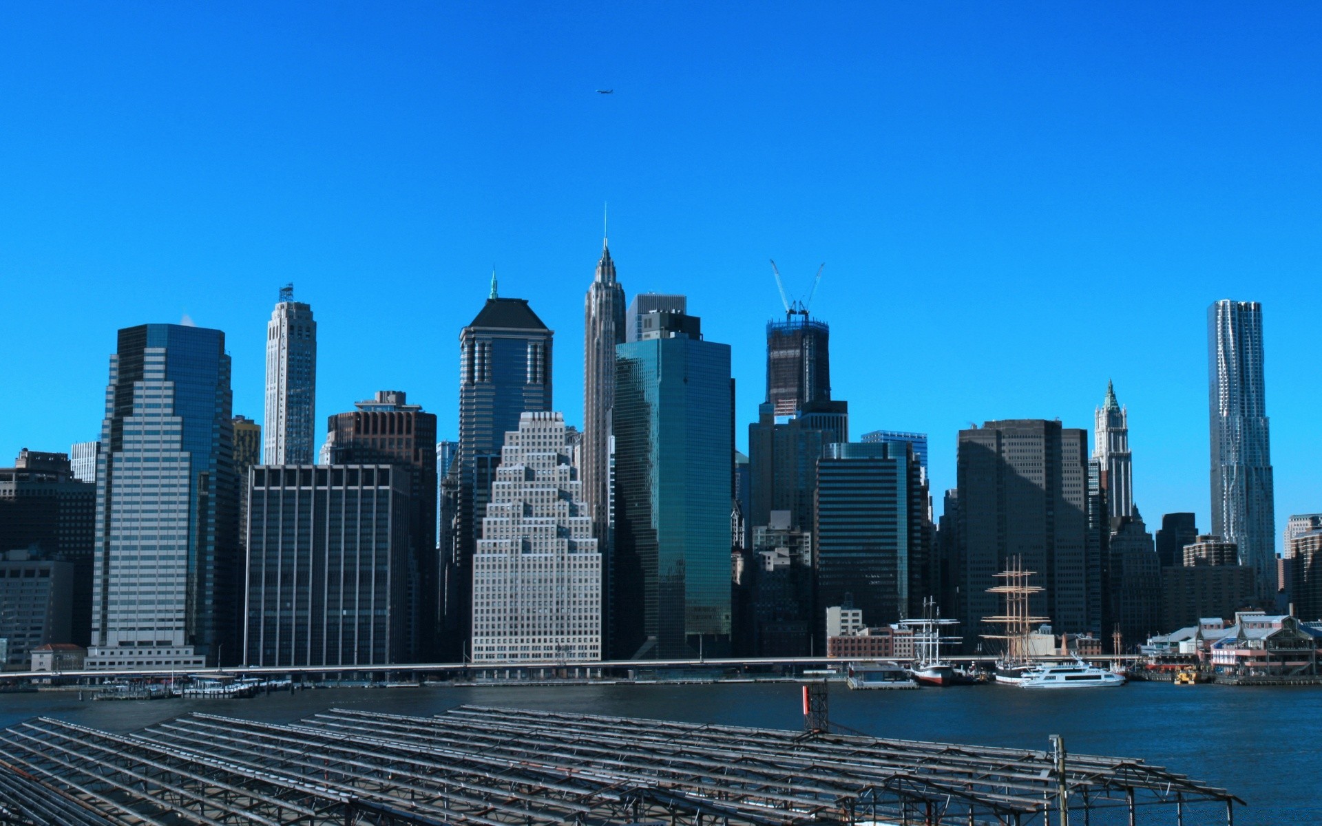Drapacze chmur na tle gałązki drzewa w szarej mgle