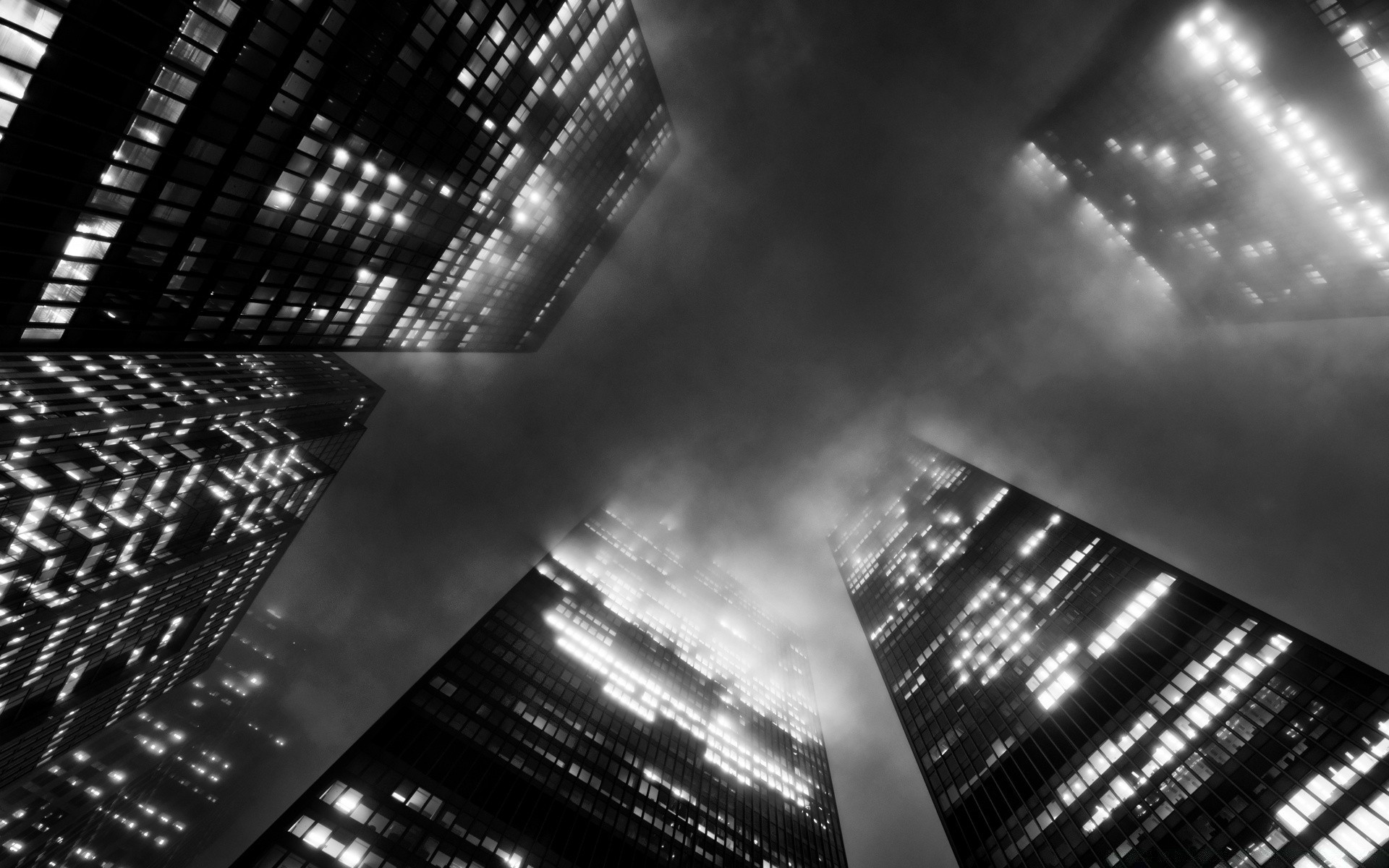 Wysokie drapacze chmur w czerni i bieli