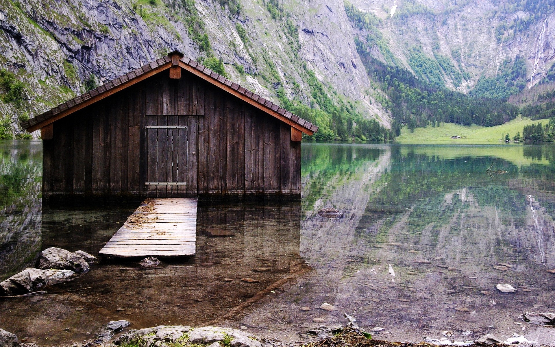 Domek nad jeziorem w pobliżu gór