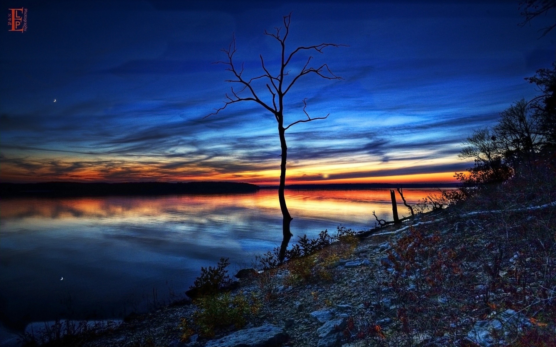 Krajobraz gołego drzewa wieczorem na tle zachodu Słońca