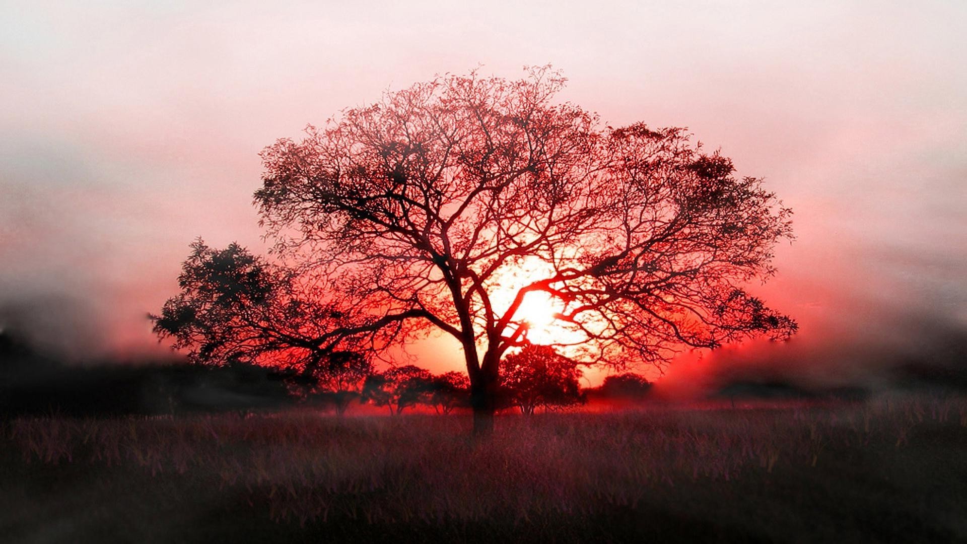 Samotne rozgałęzione drzewo w zachodzącym słońcu