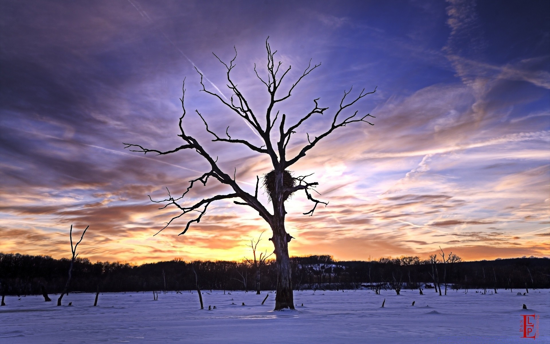 Martwe nagie drzewo o zachodzie słońca na zimowym polu