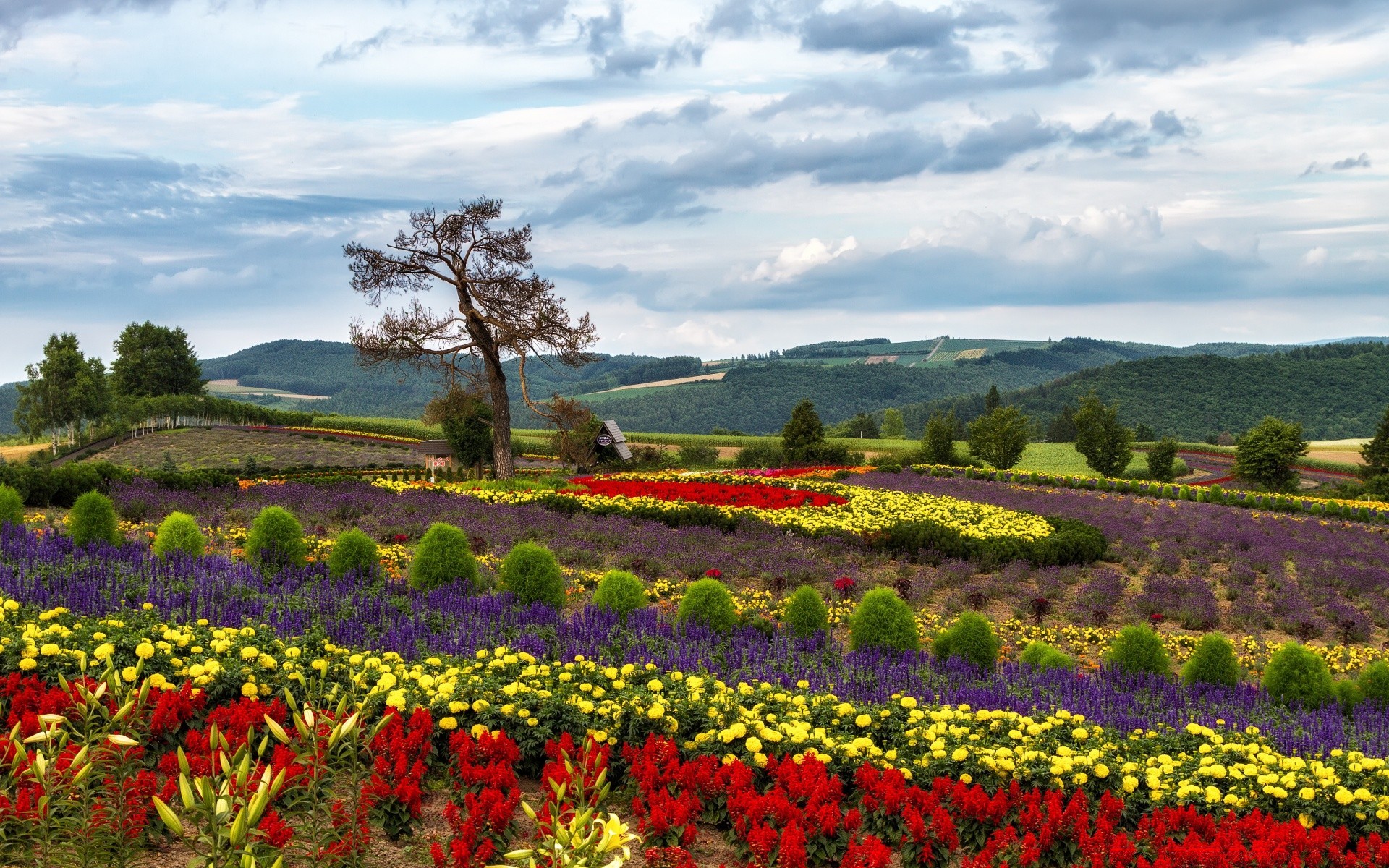 Piękny ogród kwiatów w którym znajduje się drzewo