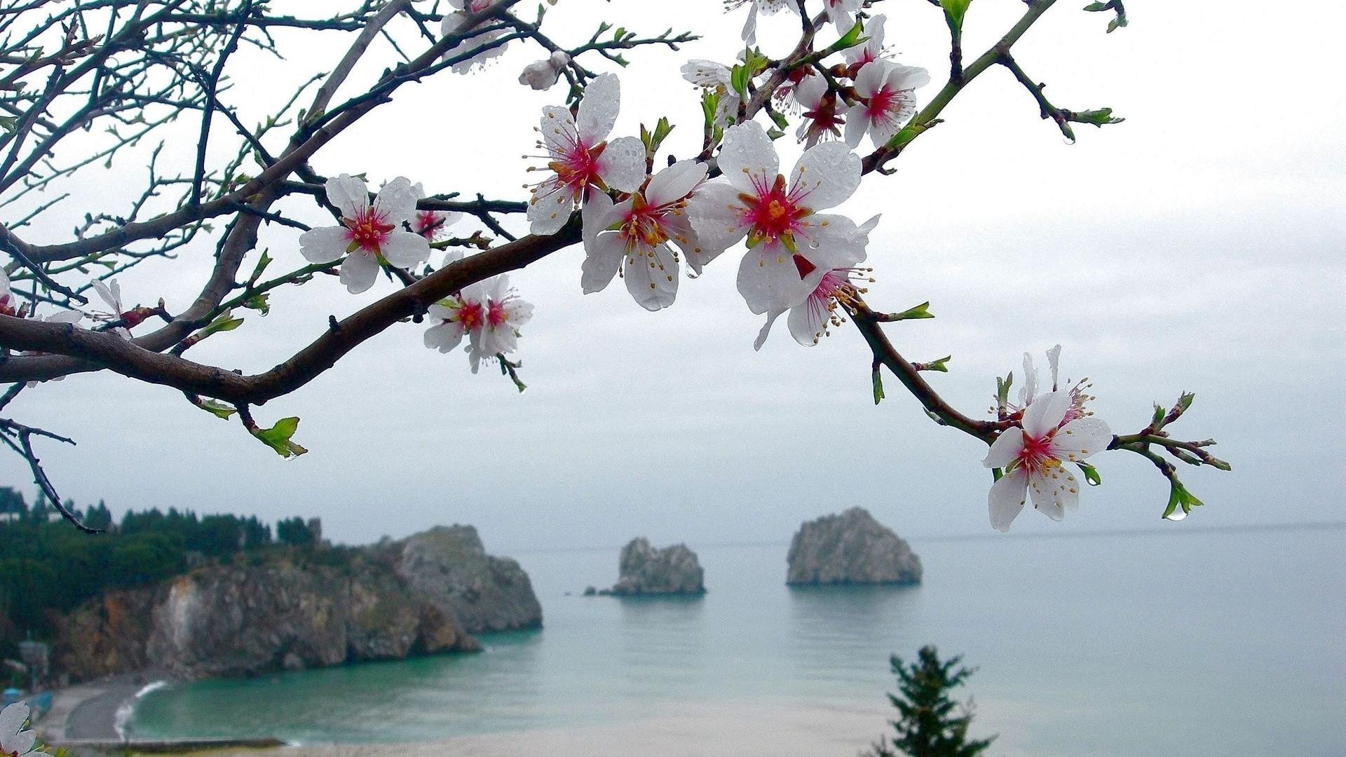 Morze, kamienie i i kwitnące drzewa wiśni
