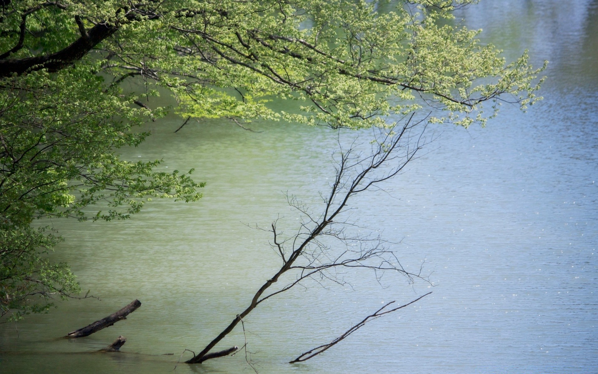 Suche drzewo na tle pięknego zachodu Słońca na brzegu którego paros drzew