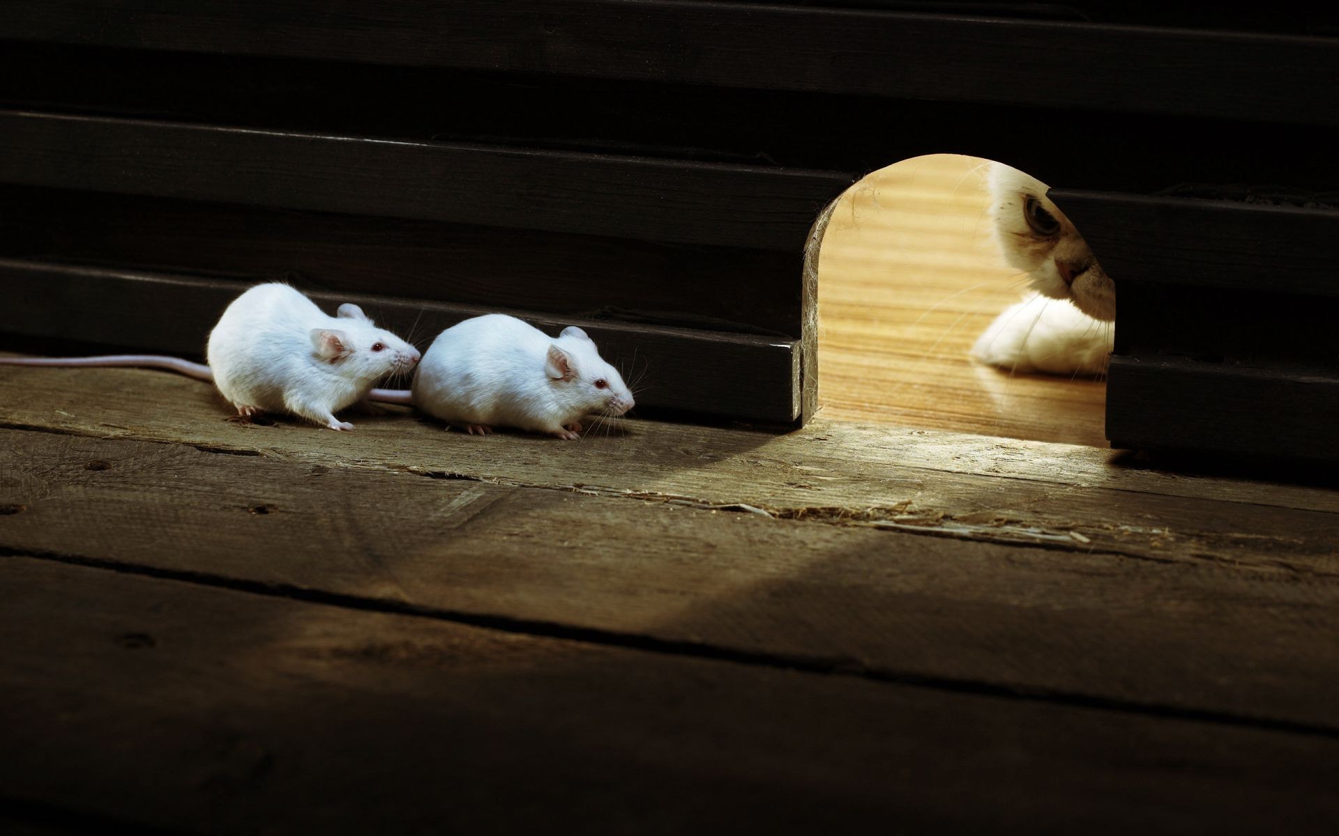 Dwie białe myszy i kot