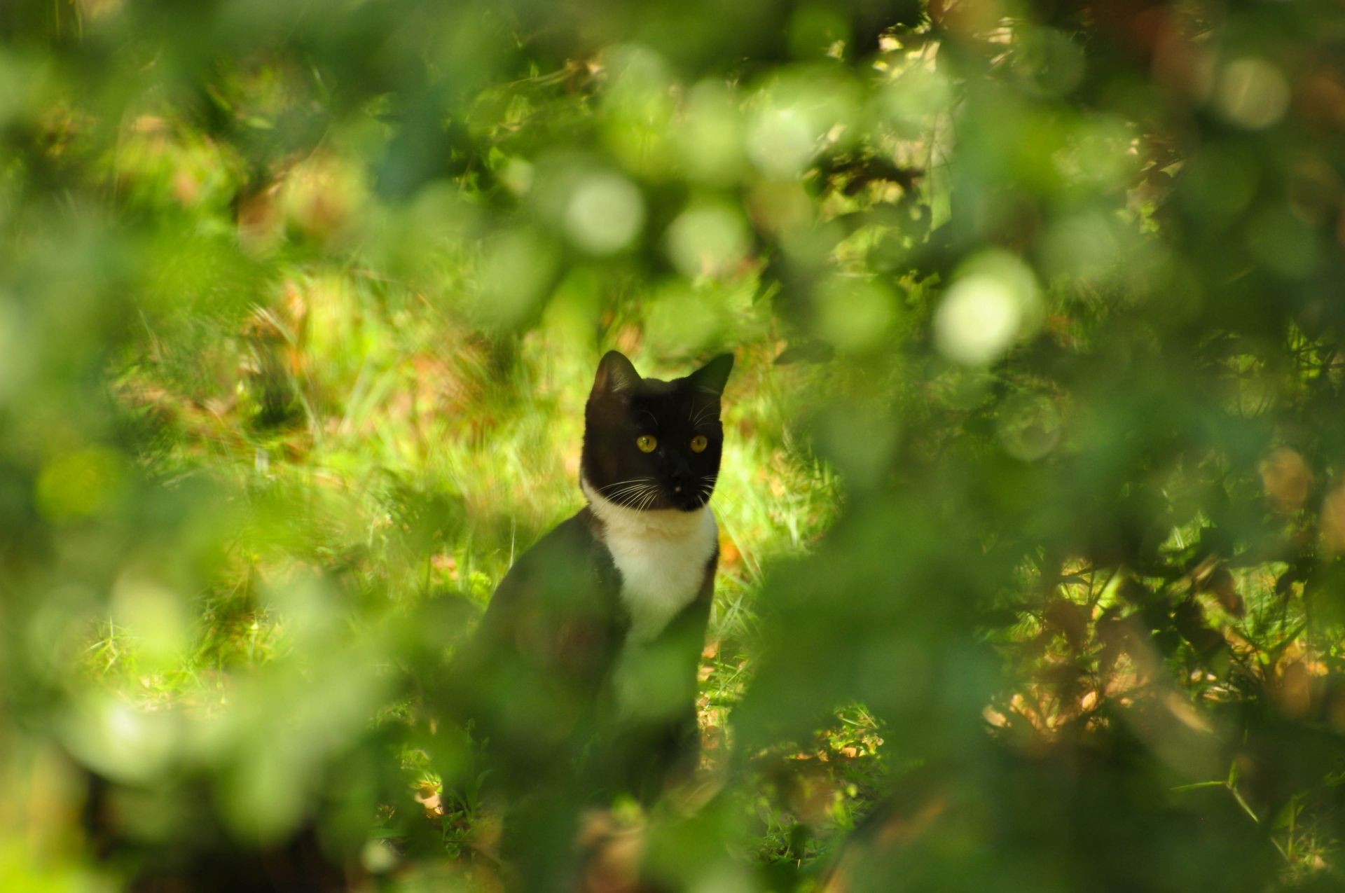 Słodki kot czai się w krzakach