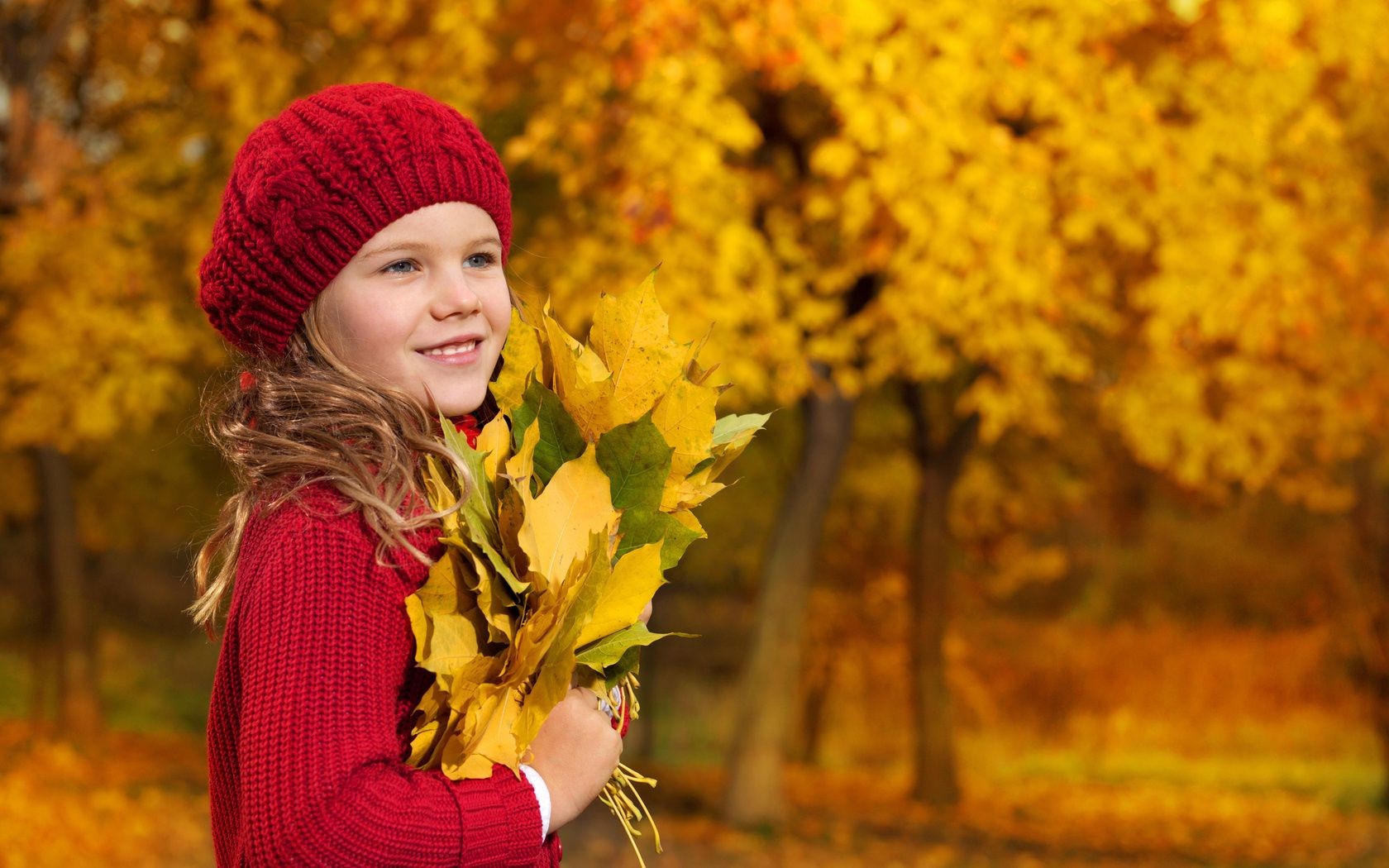 Dziewczyna w jesiennym lesie z naręczem żółtych liści