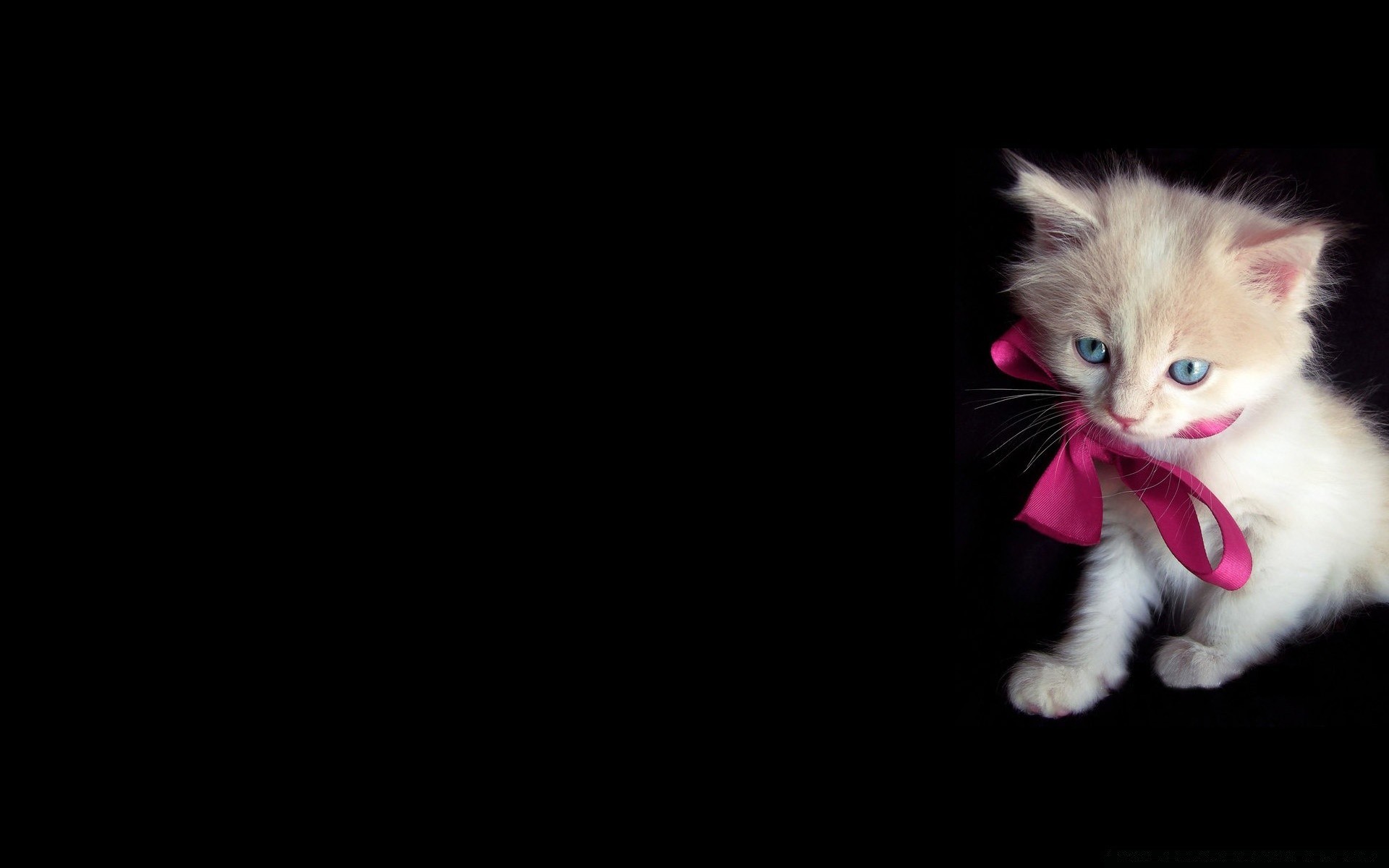 Kotek z niebieskimi oczami i różową kokardką na czarnym tle