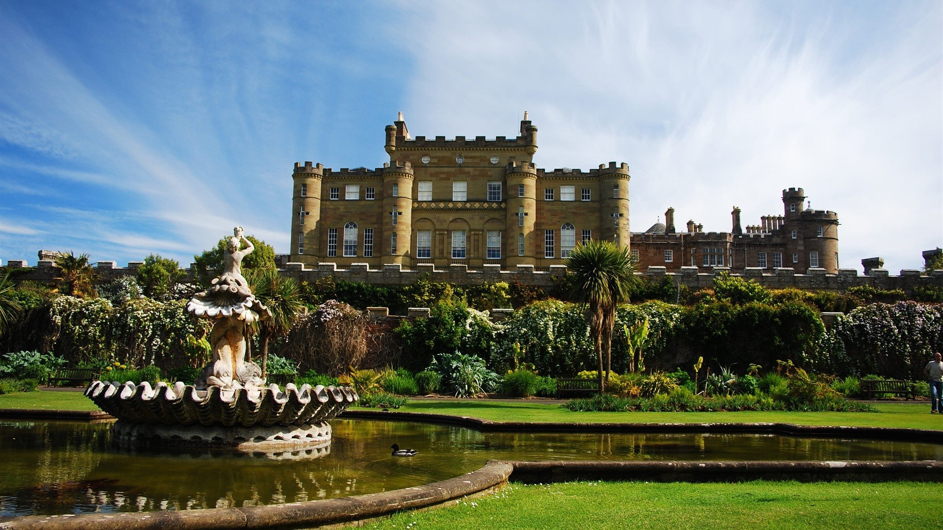 Zamek z fontanną i stawem na tle błękitnego nieba