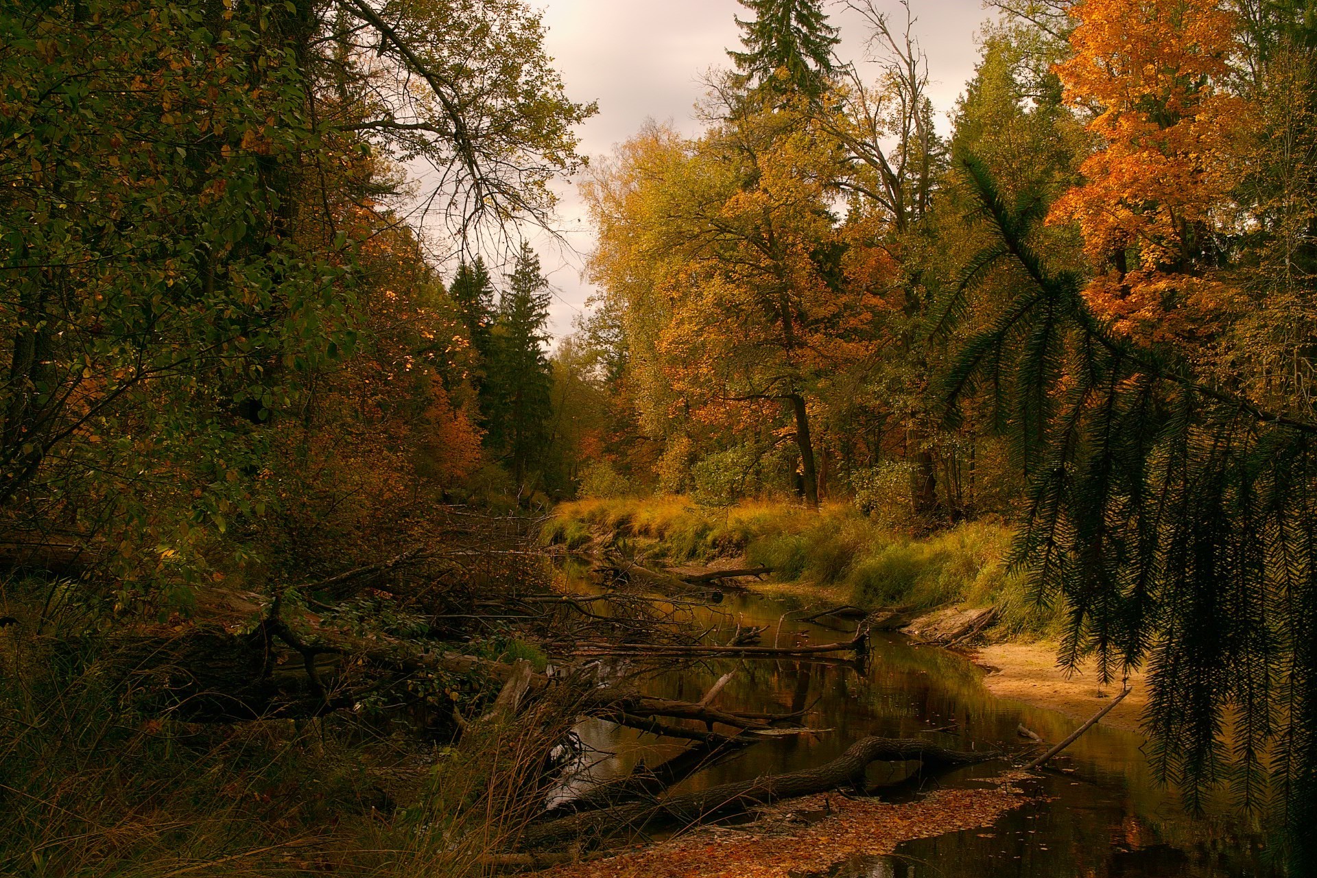 Staw w lesie wśród drzew jesienią