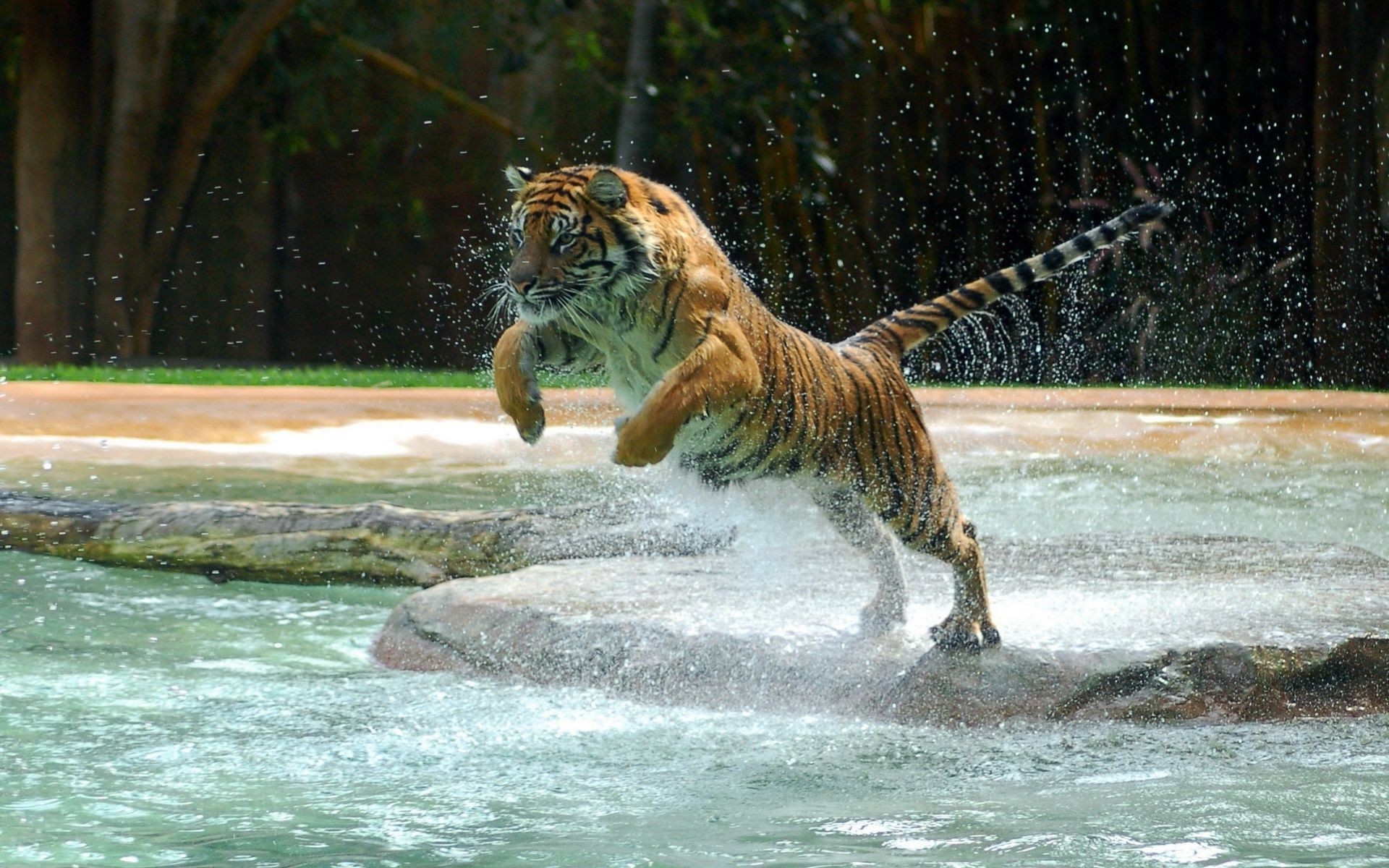 Dzika przyroda z tygrysem skaczącym nad wodą