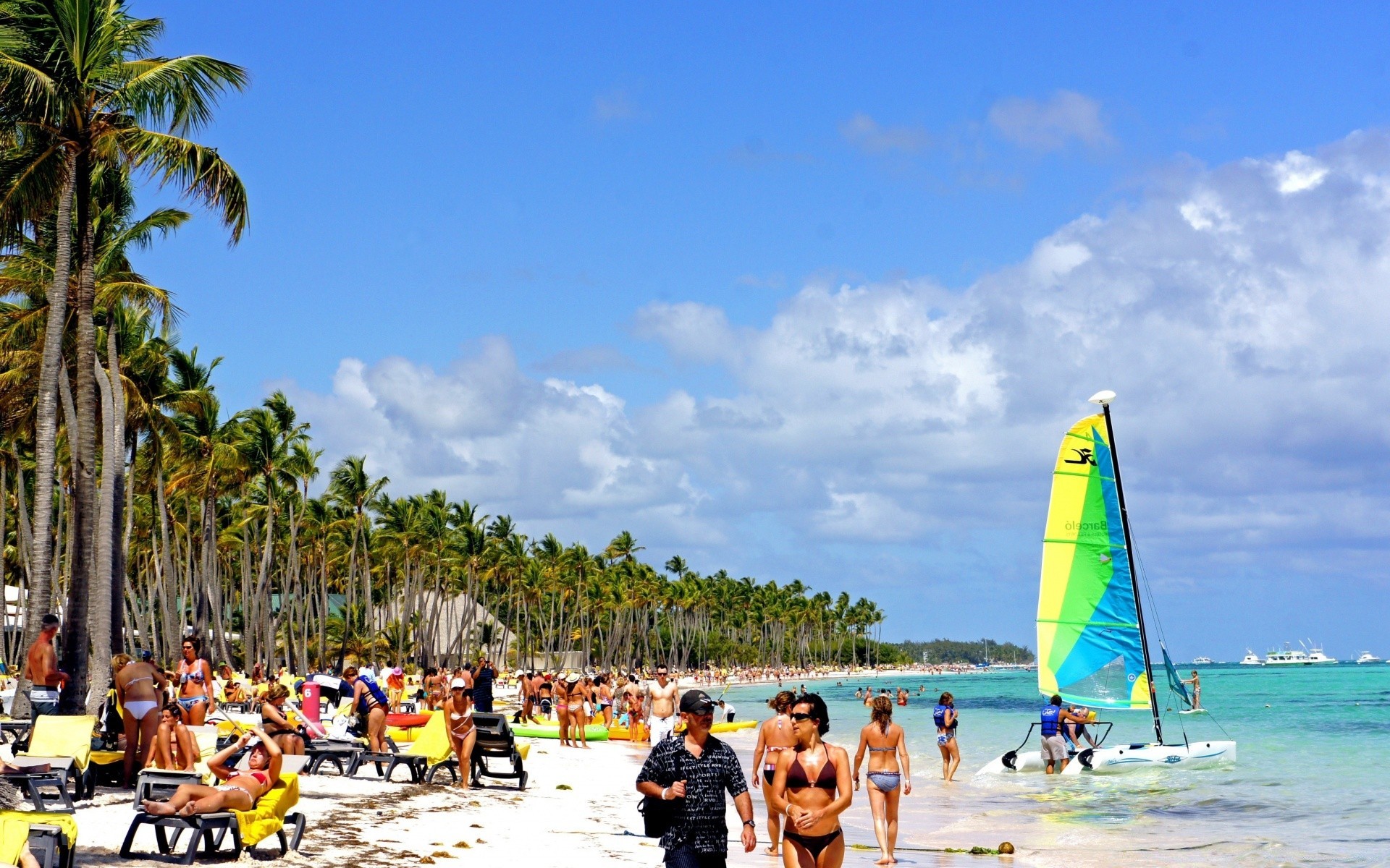 Ludzie odpoczywają na plaży pod palmami nad morzem