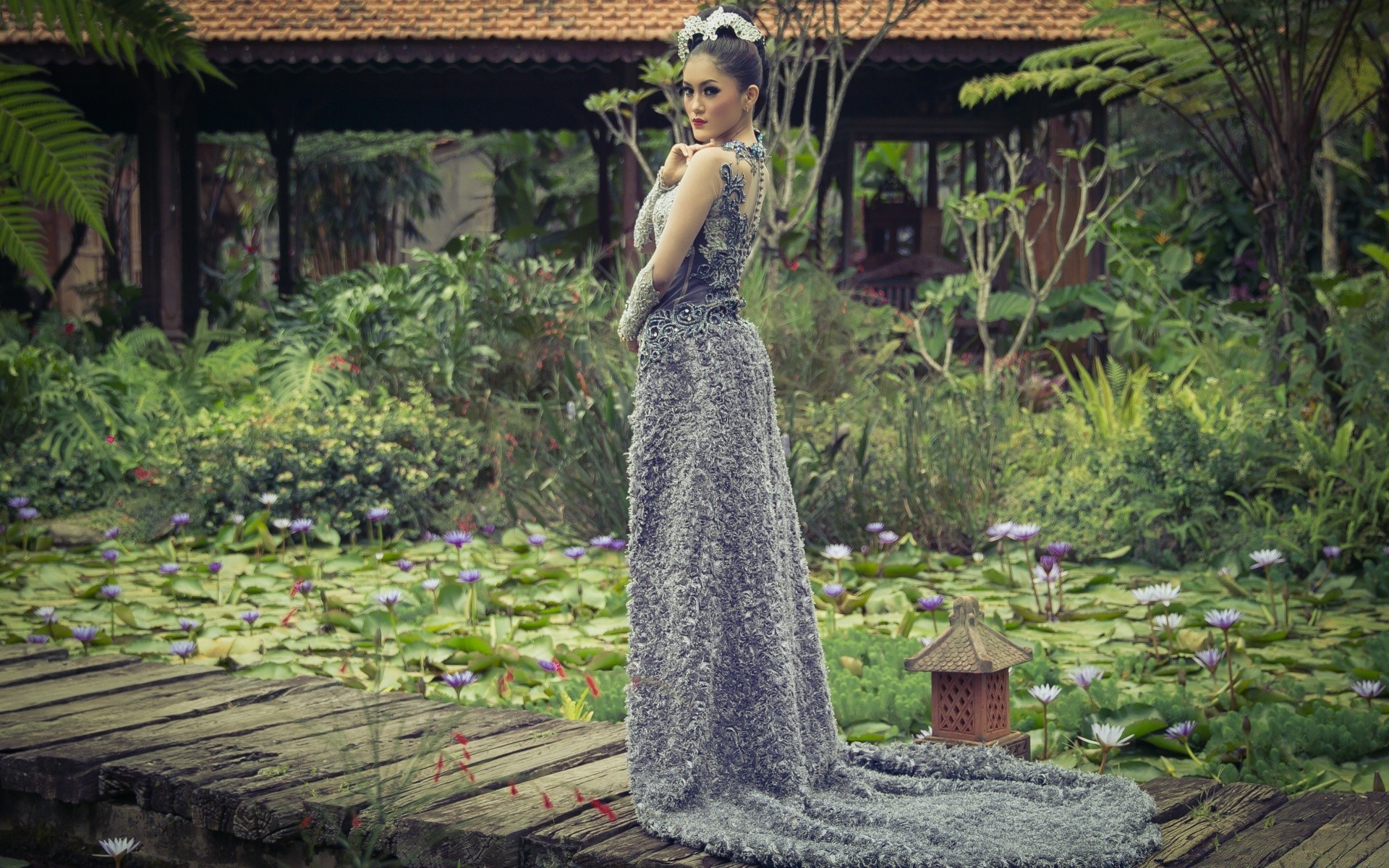 Ciemnowłosa w bordowej sukience na tle rozprysków faliCiemnowłosa w bordowej sukience na tle rozprysków fali