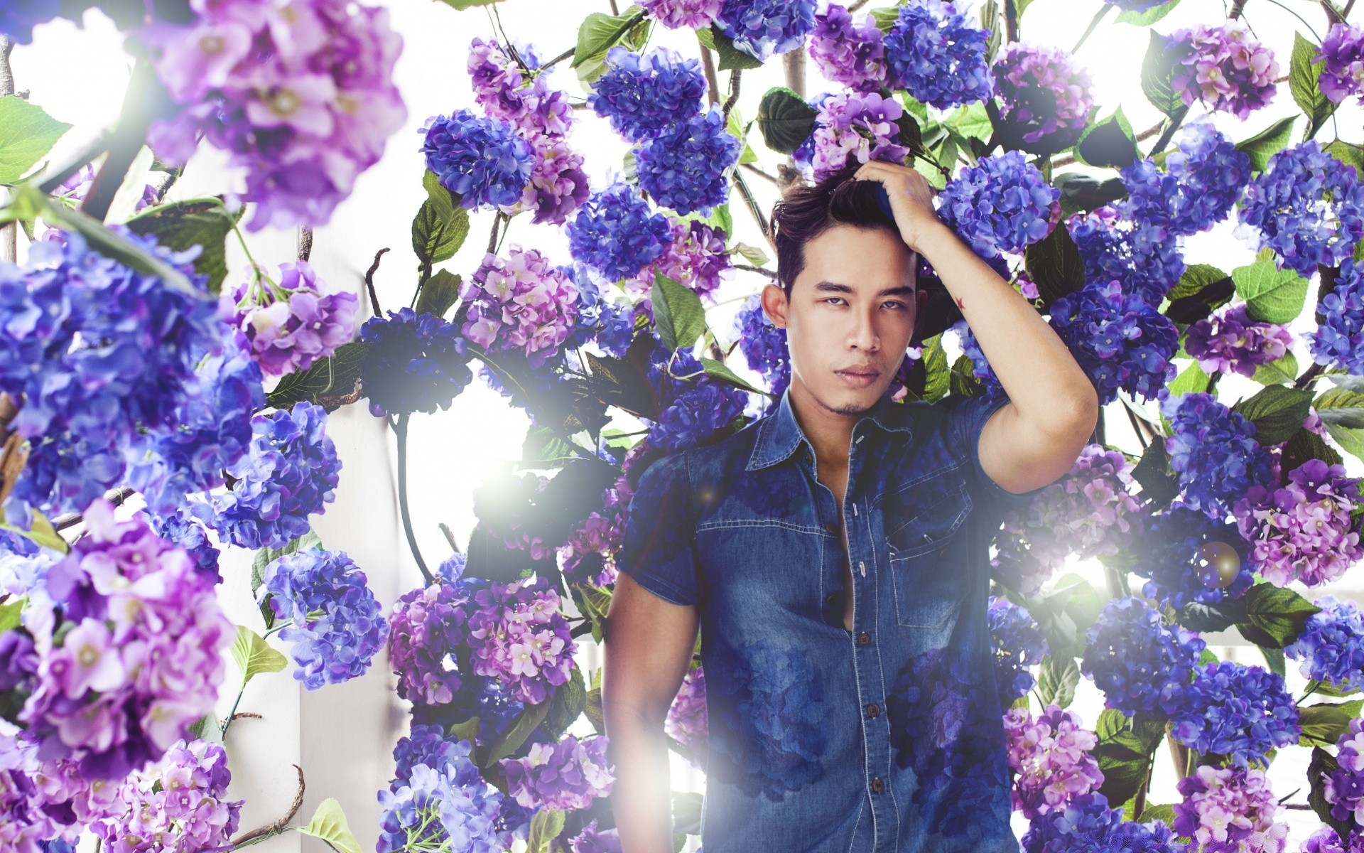 Kreatywne zdjęcie. Facet i kompozycja kwiatowa