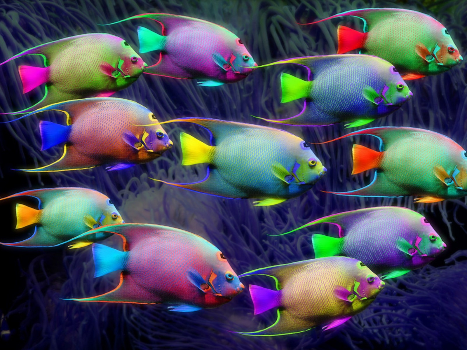 Neonowe rybki na tle glonów