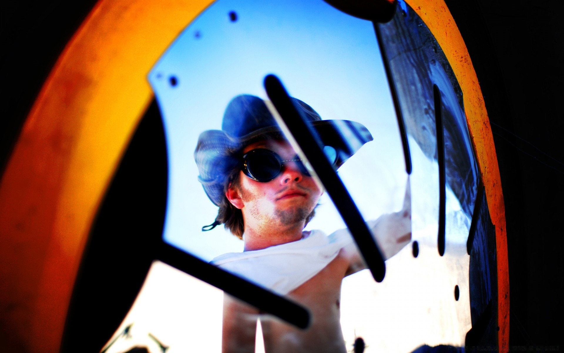Mężczyzna w ciemnych okularach na tle tłuczonych szyb