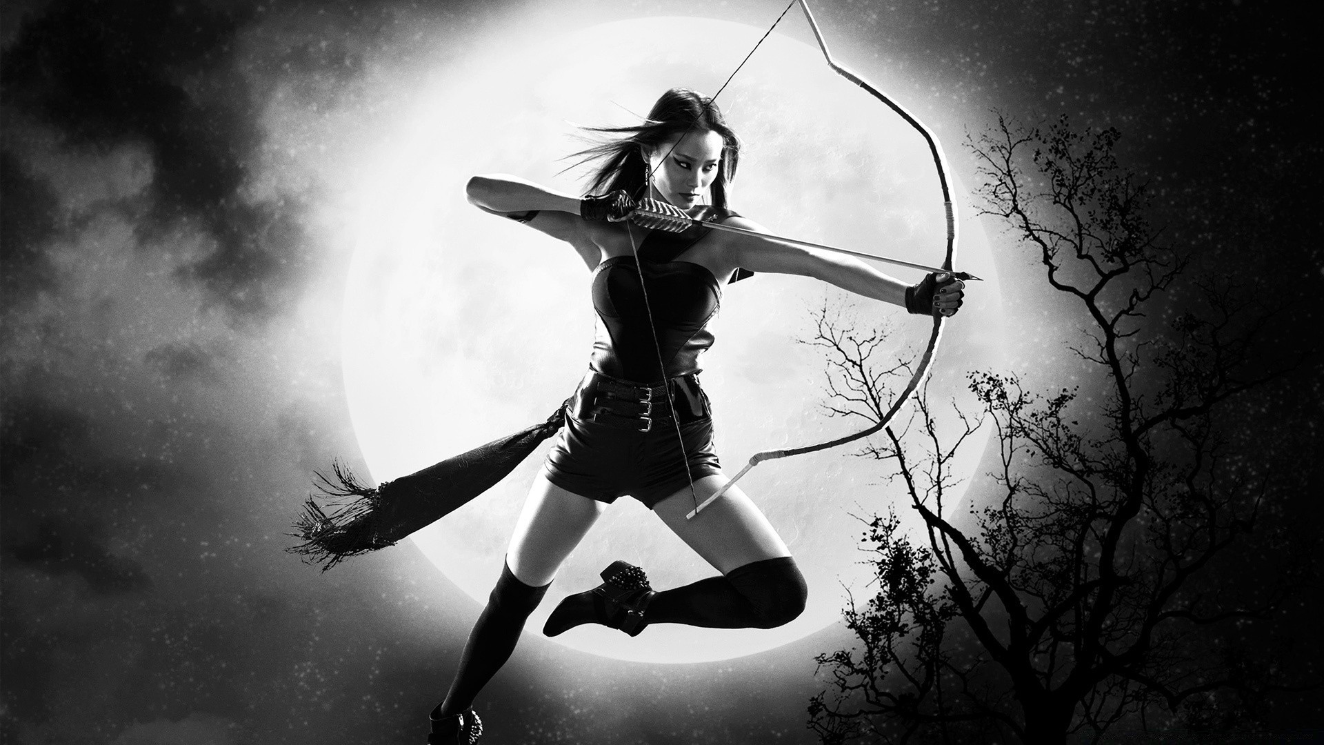 DZIEWCZYNA ŁUCZNICZKA W AKCJI NA TLE KSIĘŻYCA