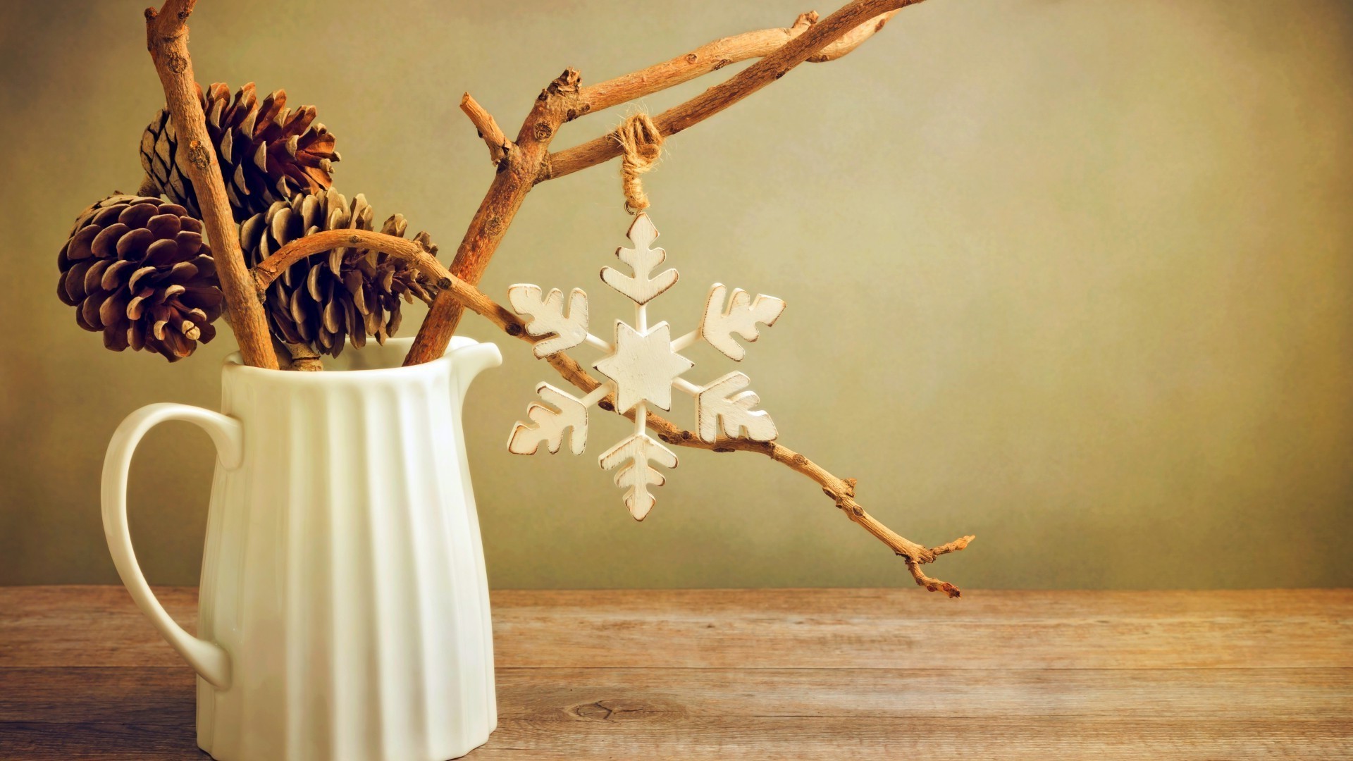Martwa natura z gałązkami w dzbanku, szyszkami świerkowymi i płatkiem śnieguMartwa natura z gałązkami w dzbanku, szyszkami świerkowymi i płatkiem śniegu
