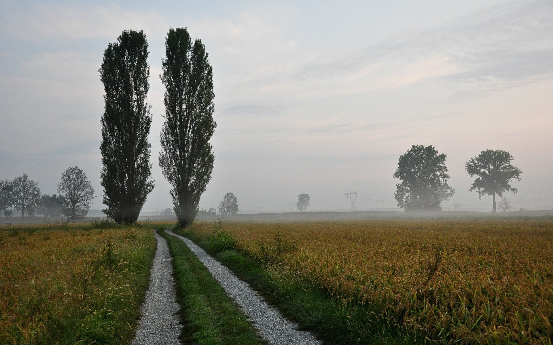 Dwa wysokie drzewa w pobliżu kollei drogowej