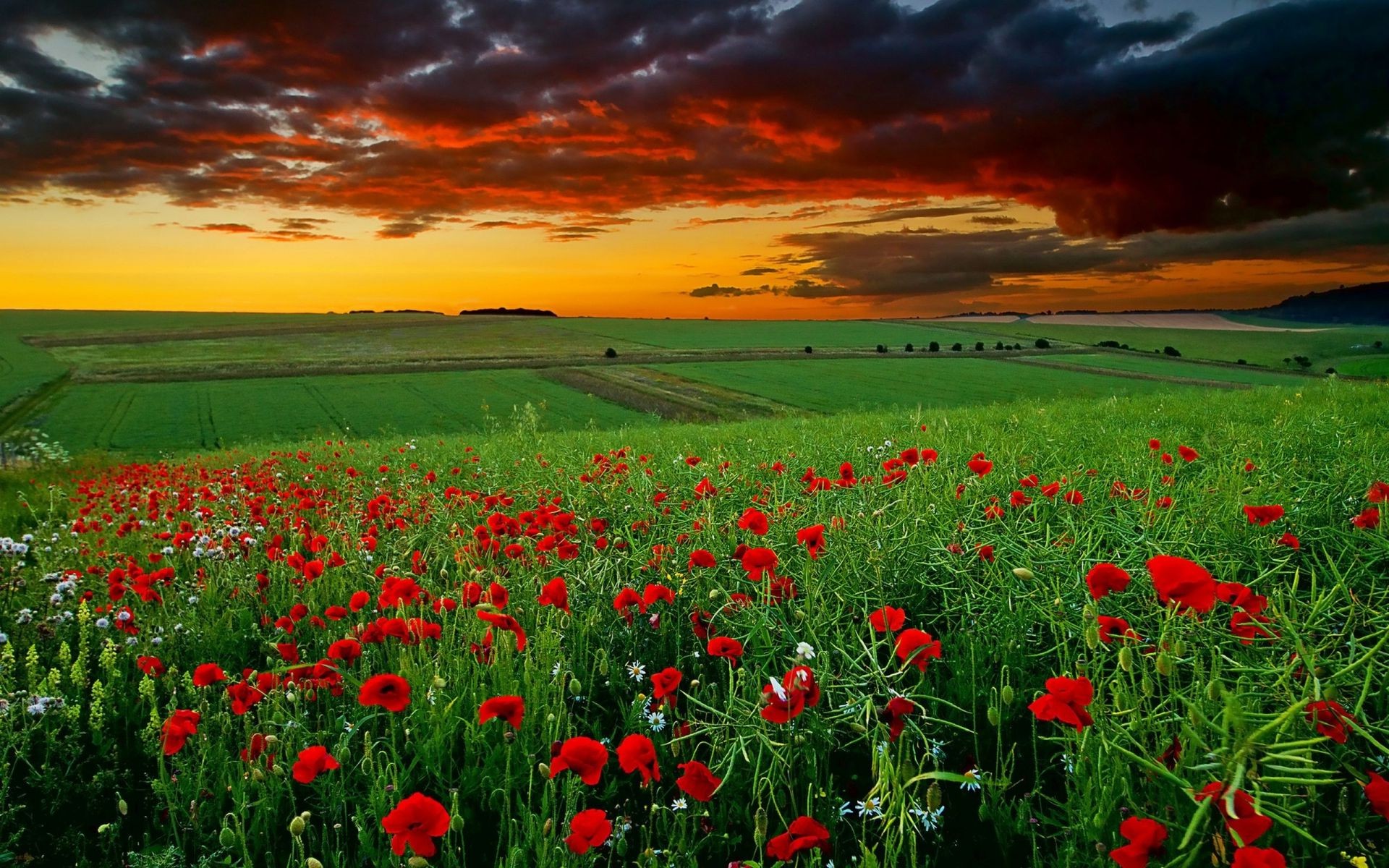 Pole kwiaty maki stokrotki Zachód słońca chmury
