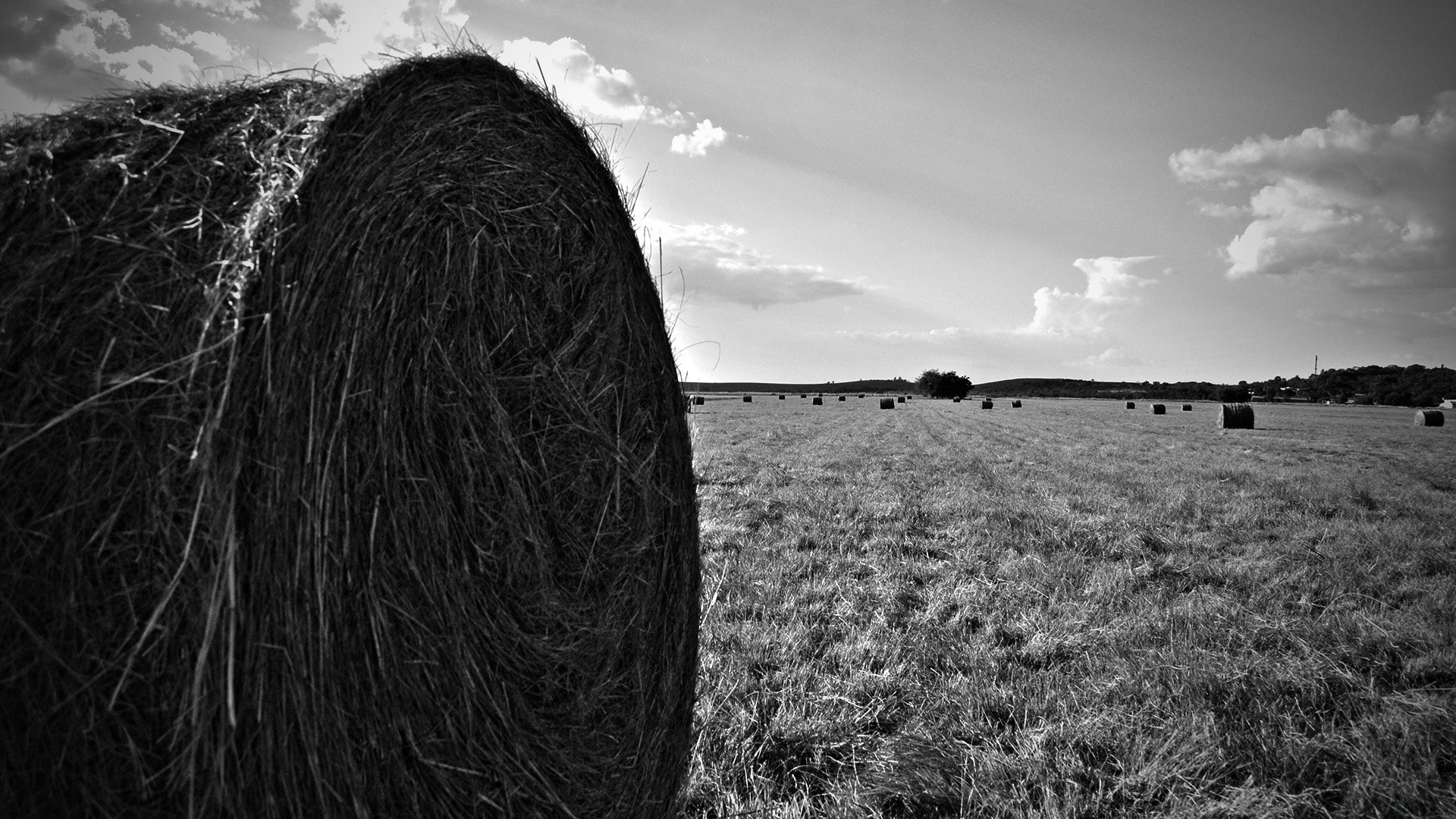 Zdjęcie ciągnika w polu na tle zachmurzonego nieba o zachodzie słońca