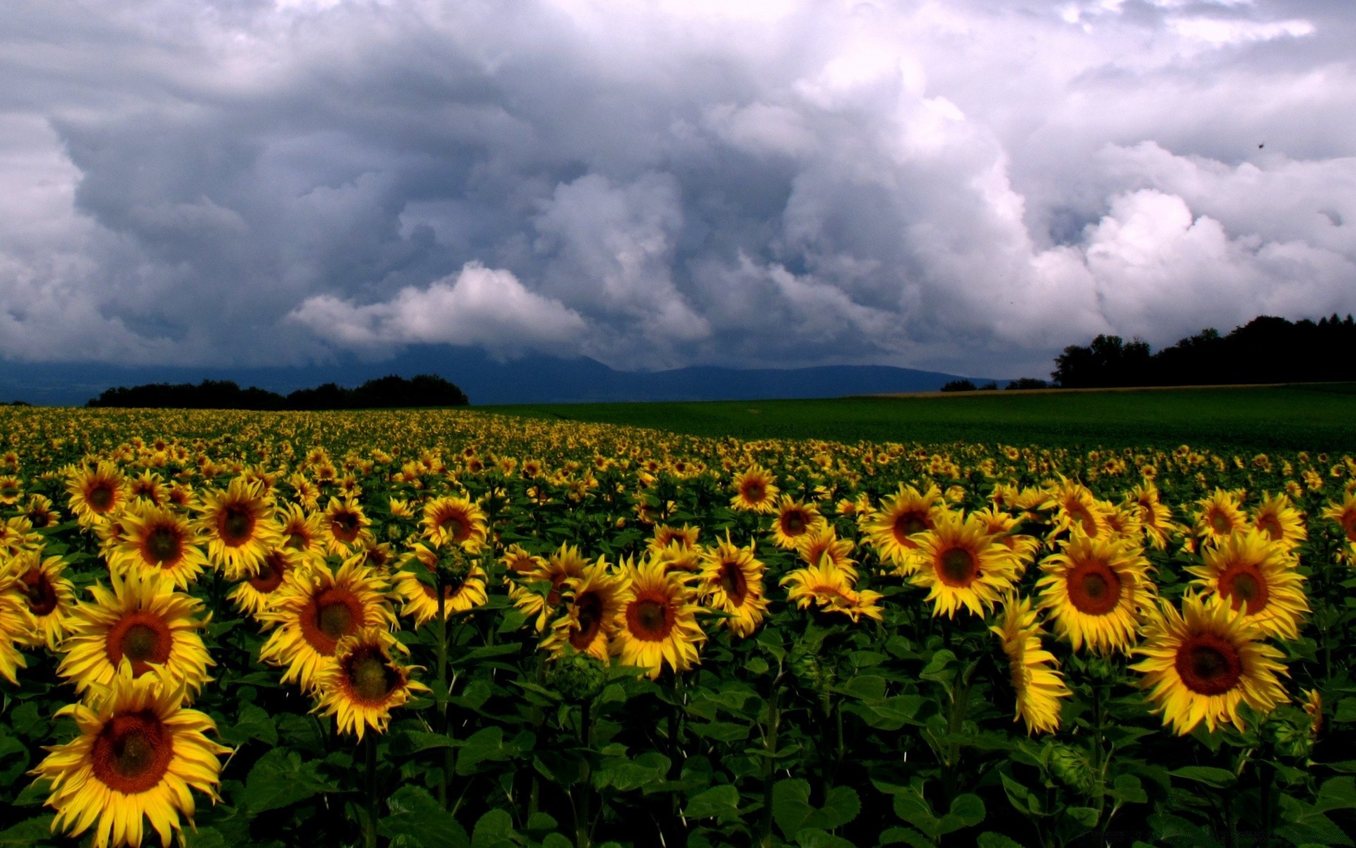 Krajobraz pola słoneczników i zachmurzonego nieba